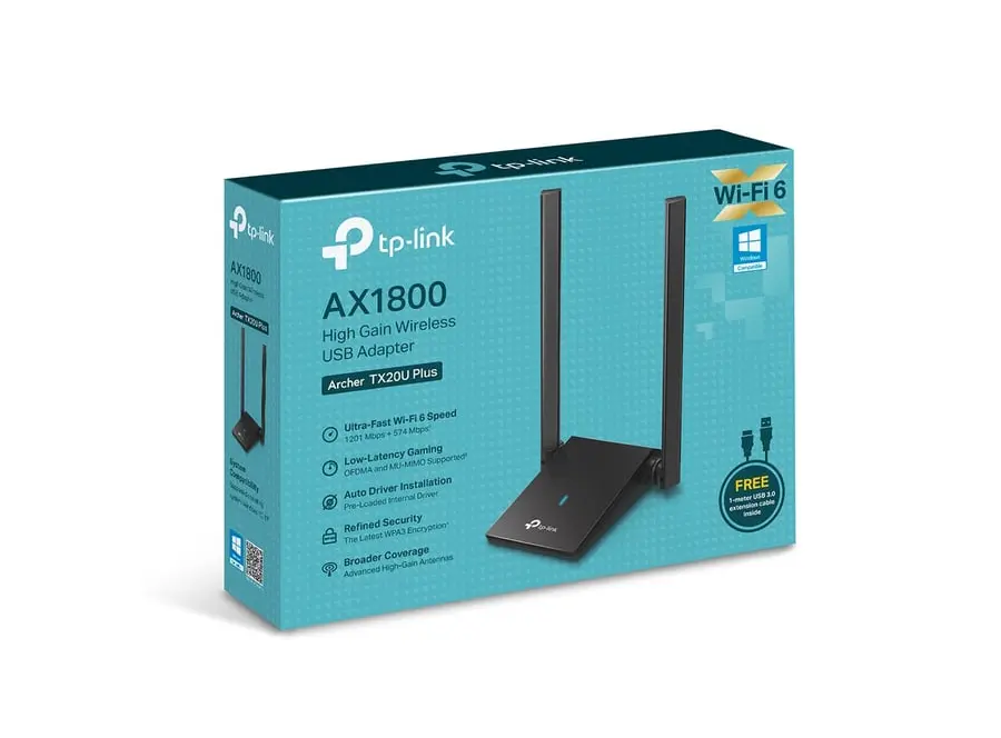 TP-Link Archer TX20U Plus AX1800 უსადენო USB ადაპტერი უზრუნველყოფს უახლესი Wi-Fi 6 ტექნოლოგიის მხარდაჭერას და გთავაზობთ მაღალსიჩქარიან, სტაბილურ და ფართო დაფარვის მქონე კავშირს. მოწყობილობა მუშაობს ორმაგ სიხშირეზე: 5 GHz სიხშირეზე მაქსიმალური სიჩქარეა 1201 Mbps, ხოლო 2.4 GHz სიხშირეზე – 574 Mbps, რაც უზრუნველყოფს საერთო 1800 Mbps სიჩქარეს. ორი მაღალი გამტარიანობის ანტენა და Beamforming ტექნოლოგია აუმჯობესებს სიგნალის მიღებას და უზრუნველყოფს სტაბილურ კავშირს დიდ მანძილზე. MU-MIMO და OFDMA ტექნოლოგიები ამცირებს ლატენტობას და აუმჯობესებს მრავალმომხმარებლიან გარემოში მუშაობას. USB 3.0 ინტერფეისი უზრუნველყოფს სწრაფ მონაცემთა გადაცემას, ხოლო WPA3 დაშიფვრა იცავს თქვენს პირად მონაცემებს. ადაპტერი თავსებადია Windows 10 და 11 ოპერაციულ სისტემებთან და Plug & Play ფუნქცია ამარტივებს ინსტალაციას.