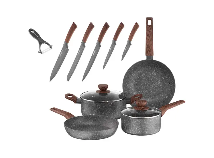 - კომპლექტი: პატარა ქვაბი, ქვაბი, ტაფა, WOK ტაფა, თავსახური - 2 ც., შეფ-მზარეულის დანა, პურის დანა, საჭრელი დანა, უნივერსალური დანა, ბოსტნეულის დანა, სათლელი