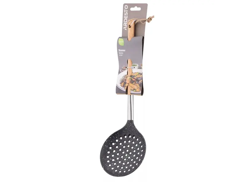 Ardesto AR1309BP Midori სკიმერი არის პრაქტიკული და გამძლე სამზარეულოს ინსტრუმენტი, რომელიც განკუთვნილია სუპის ქაფის, ზედმეტი ცხიმის ან მოხარშული საკვების ამოსაღებად. მაღალი ხარისხის უჟანგავი ფოლადის კონსტრუქცია შავი მქრქალი საფარით უზრუნველყოფს გამძლეობას, კოროზიისადმი მდგრადობას და ელეგანტურ დიზაინს. ბადიანი ზედაპირი ხელს უწყობს ზედმეტი სითხის სწრაფად გამოყოფას, ხოლო ერგონომიული სახელური კომფორტულ და უსაფრთხო ჭერას უზრუნველყოფს. იდეალური არჩევანია ყოველდღიური გამოყენებისთვის და პროფესიონალური სამზარეულოსთვის.