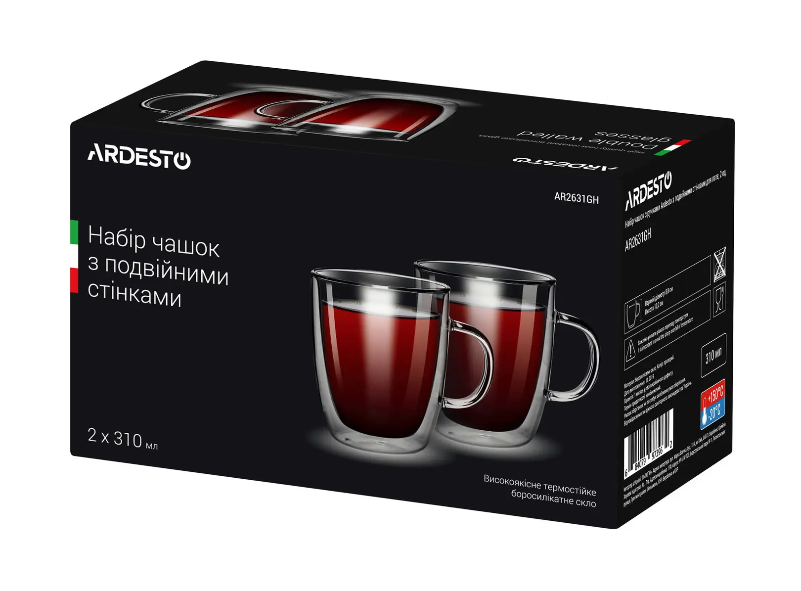 ლატეს ჭიქების ნაკრები ARDESTO Double wall borosilicate glass mug set Ardesto, 310 ml, 2 pcs, with handles