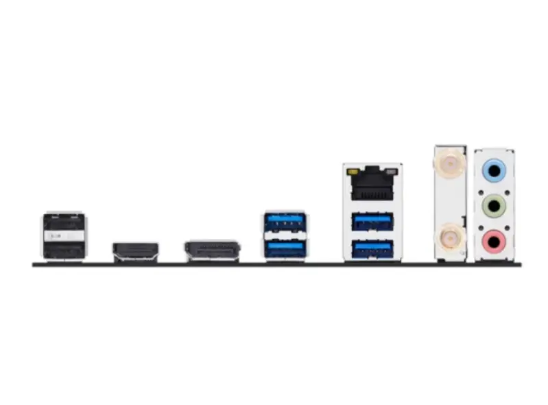 - უკანა I/O პორტები: 1 x Wi-Fi module , 4 x USB 5Gbps ports (4 x Type-A), 3 x audio jacks, 1 x DisplayPort, 2 x USB 2.0 ports (2 x Type-A), 1 x Realtek 1Gb Ethernet port, 1 x HDMI