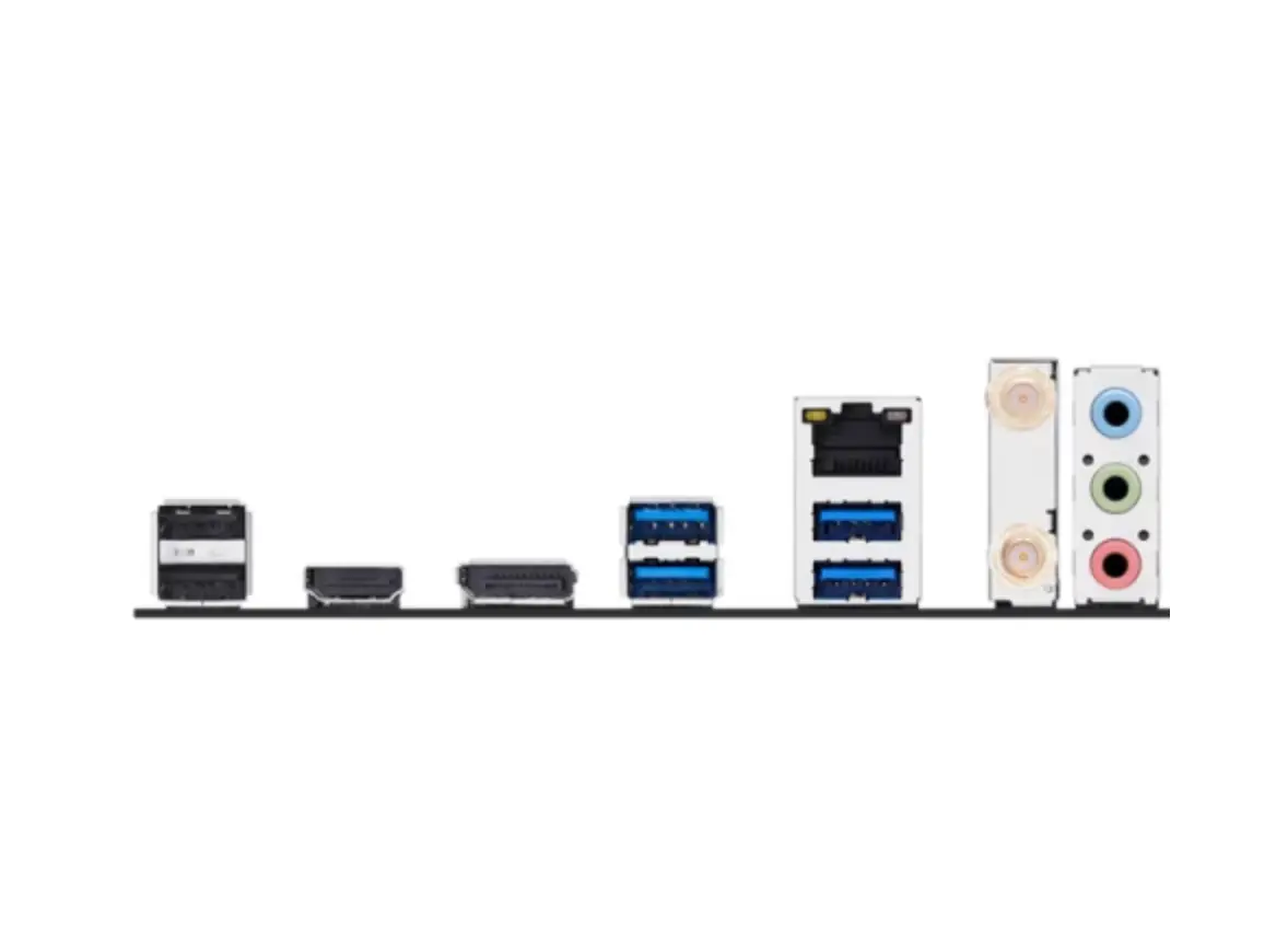 - უკანა I/O პორტები: 3 x audio jacks, 1 x DisplayPort, 2 x USB 2.0 ports (2 x Type-A), 1 x HDMI, 1 x Realtek 1Gb Ethernet port, 1 x Wi-Fi module , 4 x USB 5Gbps ports (4 x Type-A)