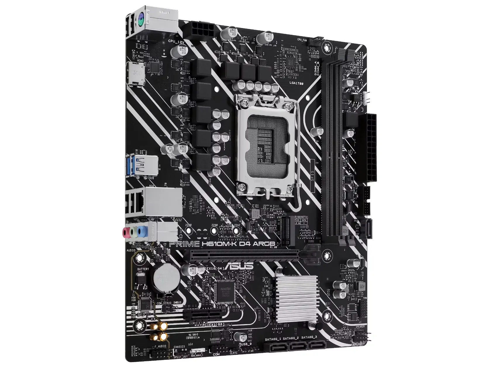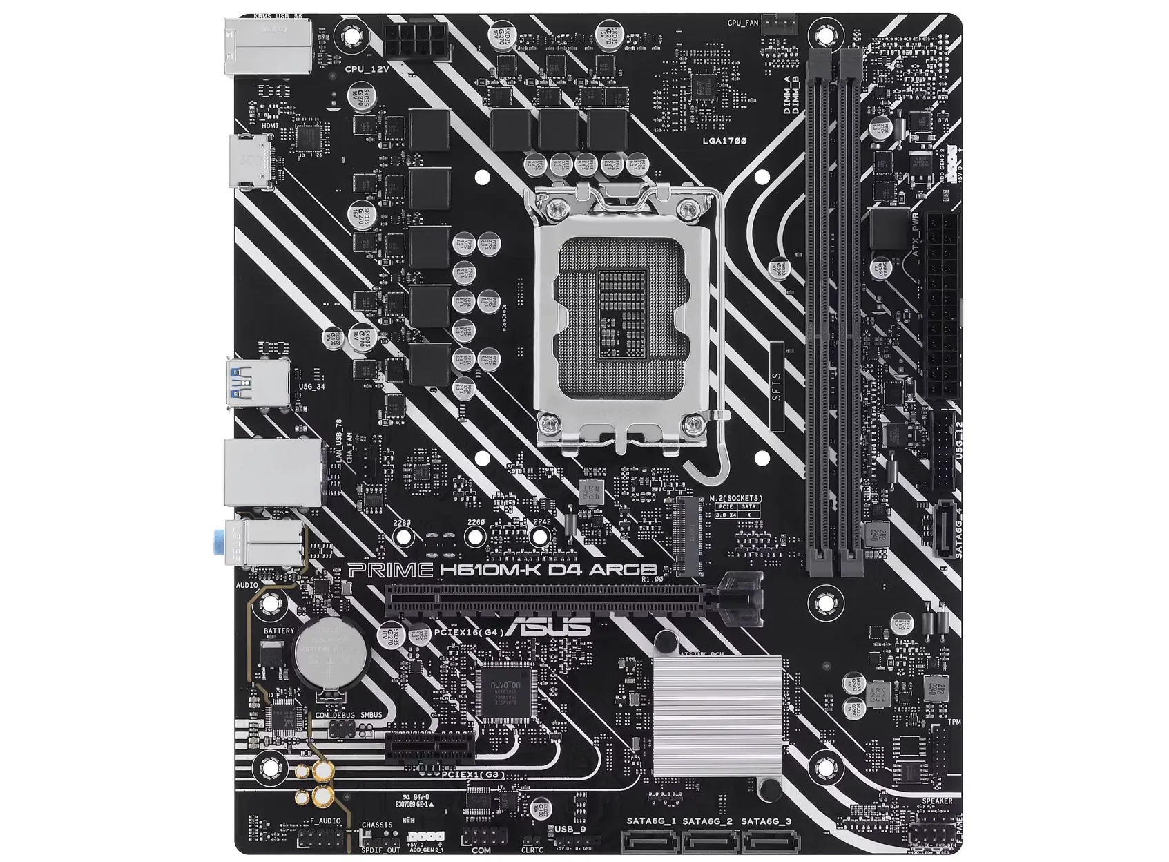 - ფორმფაქტორი: Micro-ATX — იდეალურია კომპაქტური ქეისებისთვის და ბიუჯეტური/საოფისე სისტემების ასაწყობად.