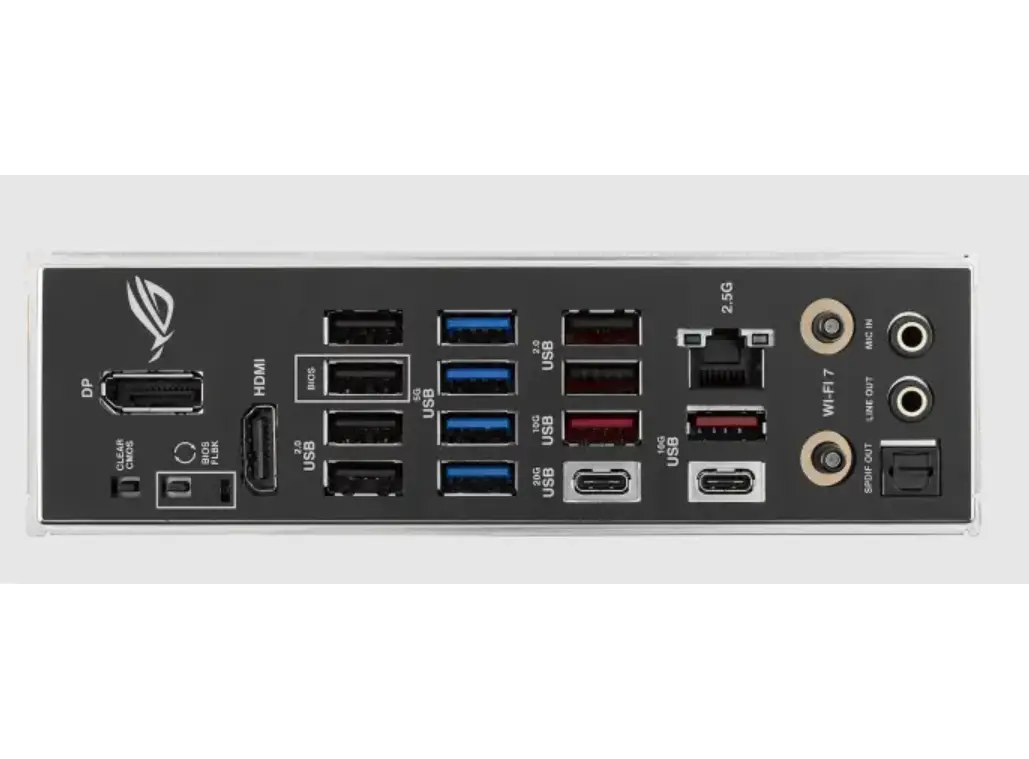- პორტები უკანა მხარეს: 1 x Wi-Fi Module 1 x Intel® 2.5Gb Ethernet 2 x Gold-plated audio jacks 1 x Optical S/PDIF out port 1 x BIOS FlashBack™ button 1 x Clear CMOS button