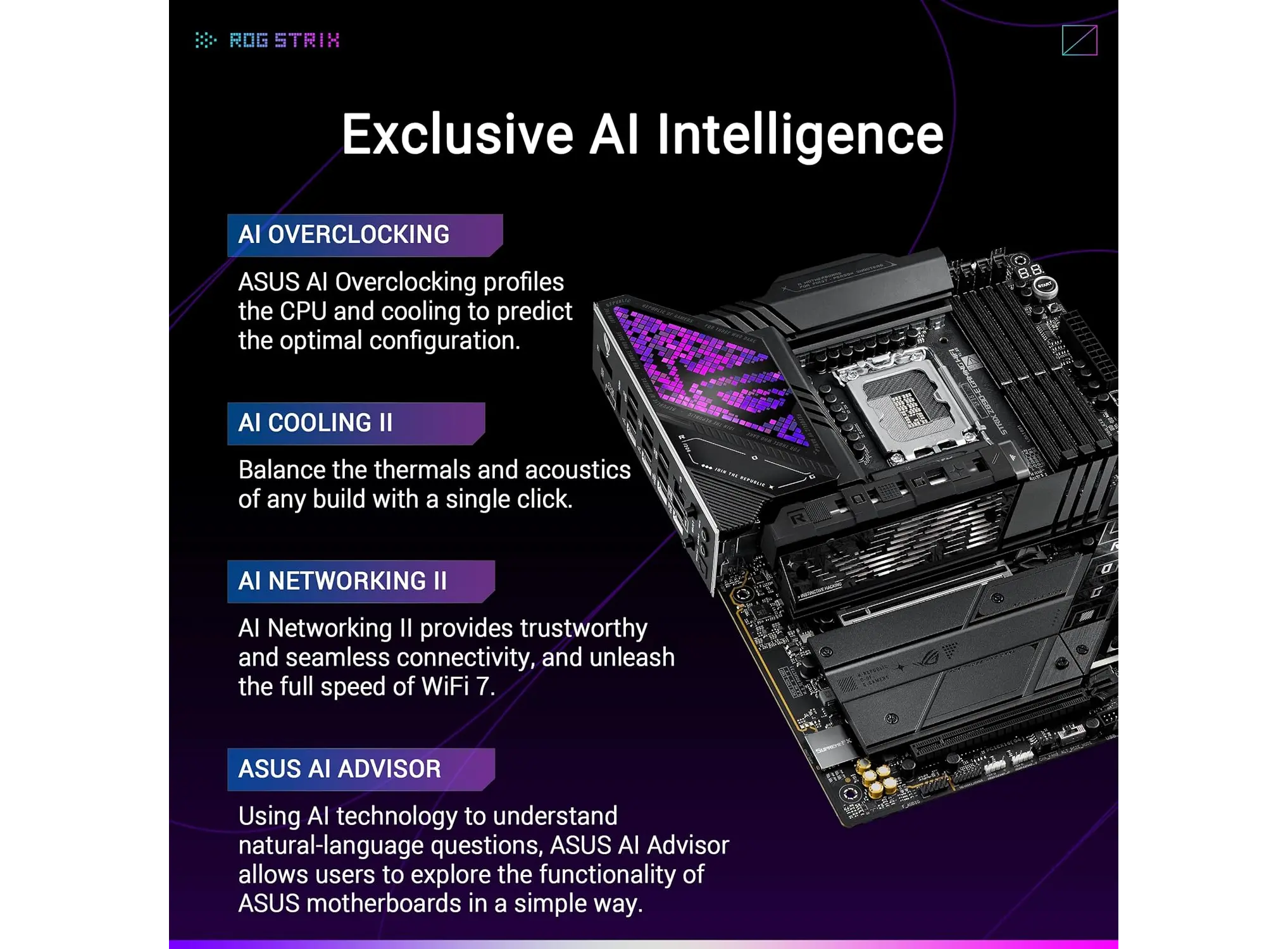 ASUS ROG Strix Z890-E Gaming WiFi არის პრემიუმ კლასის დედა დაფა, რომელიც სპეციალურად შეიქმნა უახლესი Intel Core Ultra (სერია 2) პროცესორების მაქსიმალური პოტენციალის გამოსავლენად LGA 1851 სოკეტზე. მოწყობილობა აღჭურვილია ხელოვნური ინტელექტის მოწინავე გადაწყვეტილებებით: AI Overclocking ავტომატურად ზრდის სისტემის წარმადობას, AI Cooling II უზრუნველყოფს ტემპერატურისა და ხმაურის იდეალურ ბალანსს, ხოლო AI Networking II ახდენს ინტერნეტ კავშირის ოპტიმიზაციას შეფერხებების გარეშე თამაშისთვის. დედა დაფას გააჩნია მძლავრი 18+1+2+2 კვების ფაზები, რაც უზრუნველყოფს სტაბილურ ენერგომომარაგებას ექსტრემალური დატვირთვის დროსაც კი. სისტემა მხარს უჭერს უახლეს DDR5 ტიპის ოპერატიულ მეხსიერებას, PCIe 5.0 სტანდარტს ვიდეო დაფებისა და M.2 მეხსიერებისთვის, ასევე ინტეგრირებულ WiFi 7 მოდულს სუპერ-სწრაფი უსადენო კავშირისთვის. ROG Strix Z890-E გამოირჩევა ფუტურისტული დიზაინით, Polymo განათებით და აწყობის გამარტივებული მექანიზმებით (Q-Release, Q-Latch), რაც მას იდეალურ არჩევანს ხდის ენთუზიასტი გეიმერებისა და პროფესიონალებისთვის.