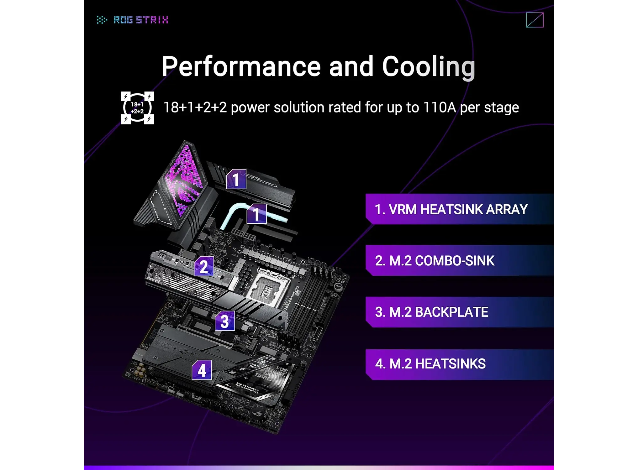 - მძლავრი გაგრილება: მასიური რადიატორები VRM ზონისთვის და ინტეგრირებული M.2 სლოტების გამაგრილებლები.