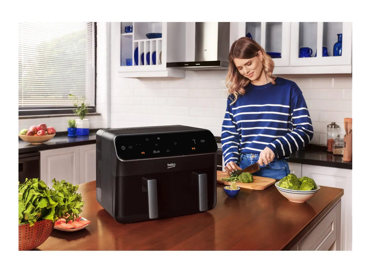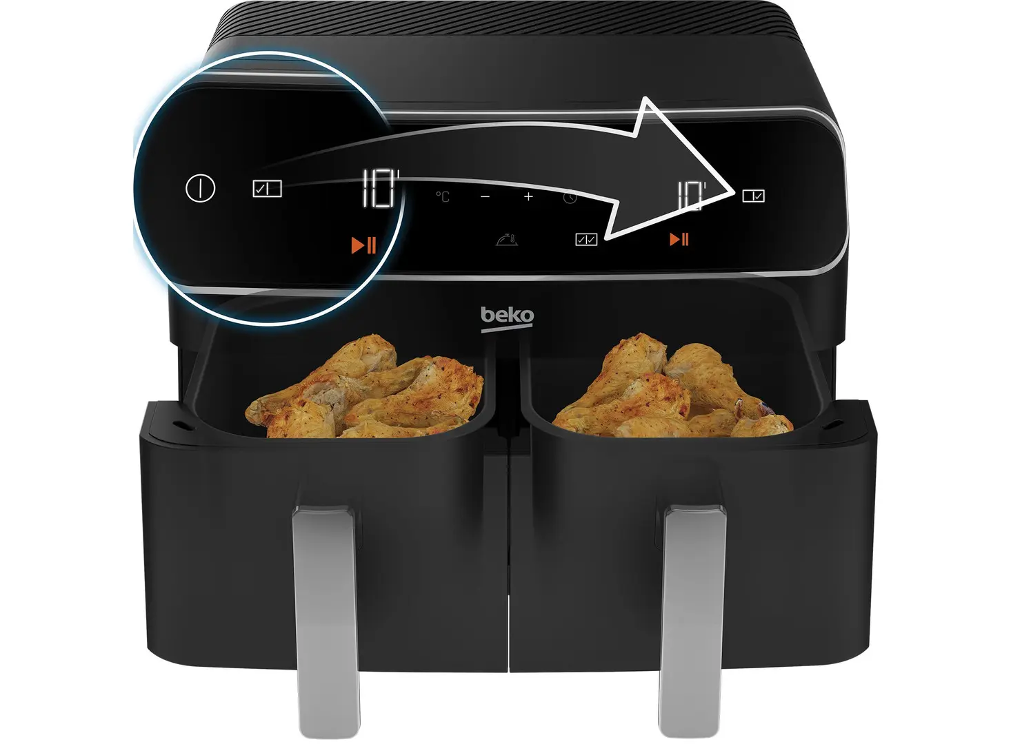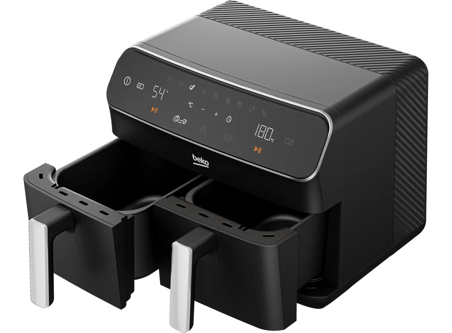 ორმაგი ზონის დიზაინი და 2x4.25 ლიტრიანი კალათები საშუალებას გაძლევთ ერთდროულად მოამზადოთ სხვადასხვა კერძები. მოწყობილობა აღჭურვილია LED სენსორული ეკრანით, რომელიც უზრუნველყოფს მარტივ და ინტუიციურ მართვას.