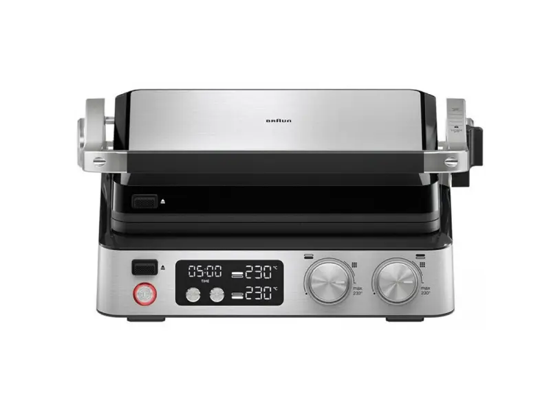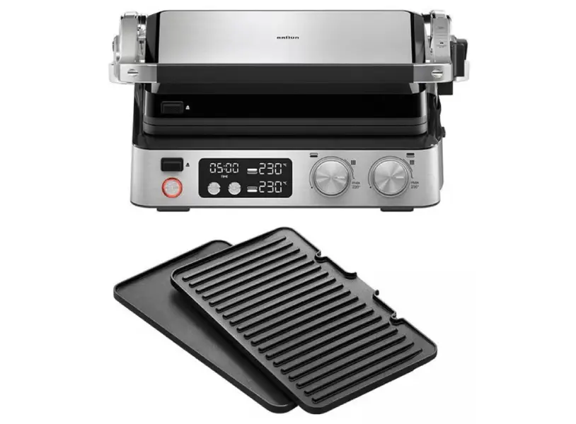 გრილი Braun CG7040 MultiGrill 7 წარმოადგენს მრავალფუნქციურ სამზარეულოს მოწყობილობას, რომელიც აერთიანებს მაღალი ეფექტურობის ტექნოლოგიასა და სივრცის ეკონომიას. მისი 2000 ვატიანი სიმძლავრე და ორი დამოუკიდებელი 29x23 სმ-ის ზომის ფირფიტა საშუალებას გაძლევთ ერთდროულად მოამზადოთ სხვადასხვა კერძი. გრილი გთავაზობთ სამ მომზადების პოზიციას: კონტაქტური, ღია და ღუმელის რეჟიმი, რაც უზრუნველყოფს მრავალფეროვან მომზადების შესაძლებლობებს. მოწყობილობა აღჭურვილია ციფრული ტაიმერით, ტემპერატურის ინდივიდუალური კონტროლით და არაწებოვანი ფირფიტებით, რომლებიც ადვილად იწმინდება და შესაძლებელია მათი ჭურჭლის სარეცხ მანქანაში მოთავსება. კომპაქტური დიზაინი და უჟანგავი ფოლადის კორპუსი ხდის მას იდეალურ არჩევანს ნებისმიერი სამზარეულოსთვის.