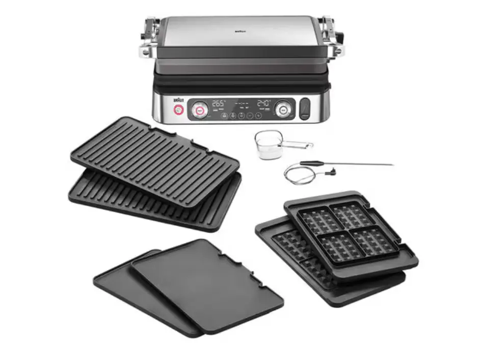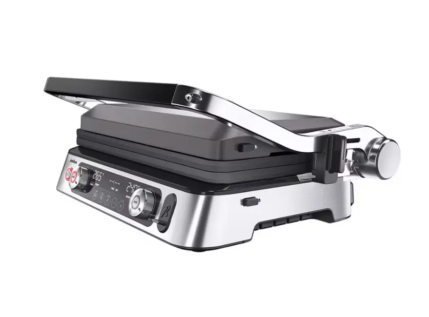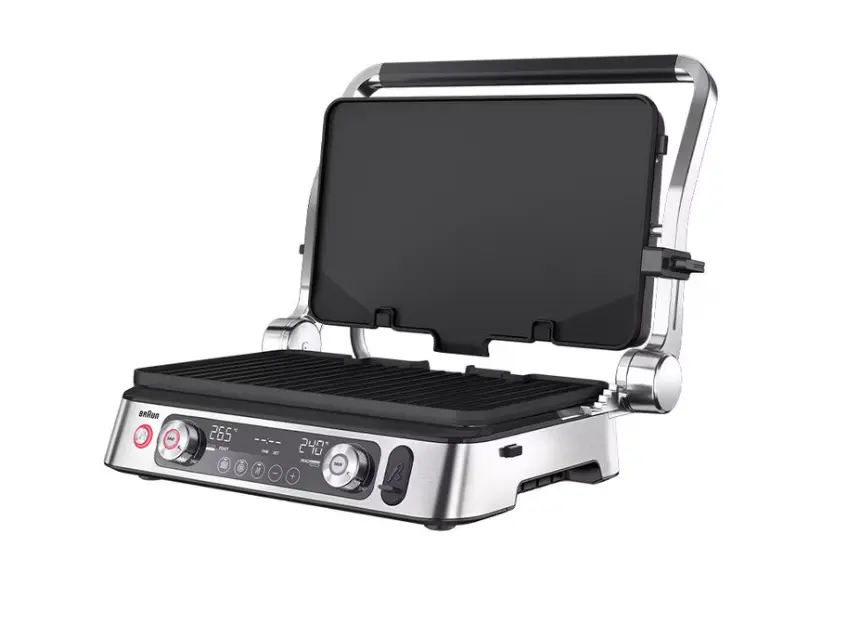 BRAUN CG9167 MultiGrill 9 Pro არის მრავალფუნქციური ელექტრო გრილი, რომელიც აერთიანებს პროფესიონალურ შესაძლებლობებსა და მოხერხებულობას. მისი 2200 ვატიანი სიმძლავრე და ჩაშენებული გათბობის ელემენტები უზრუნველყოფს სწრაფ და თანაბარ გათბობას. ინტეგრირებული თერმოპრობას საშუალებით შეგიძლიათ ზუსტად განსაზღვროთ ხორცის მზადყოფნის დონე. გრილი გთავაზობთ სამ სამზარეულო პოზიციას: კონტაქტური, ღია და ღუმელის რეჟიმი, რაც ზრდის მისი გამოყენების შესაძლებლობებს. კომპლექტში შედის 6 ცალი ფირფიტა: 2 გრილის, 2 ბრტყელი და 2 ვაფლისთვის. ცალკე ტემპერატურის კონტროლი ზედა და ქვედა ფირფიტებისთვის იძლევა საშუალებას ერთდროულად მოამზადოთ სხვადასხვა ტიპის საკვები. სარეცხი მანქანაში გარეცხვის შესაძლებლობა და ცხიმის მოსაშორებელი უჯრა ამარტივებს მოვლას. BRAUN CG9167 MultiGrill 9 Pro იდეალურია მათთვის, ვინც ეძებს მრავალფუნქციურ და ეფექტურ სამზარეულოს მოწყობილობას.