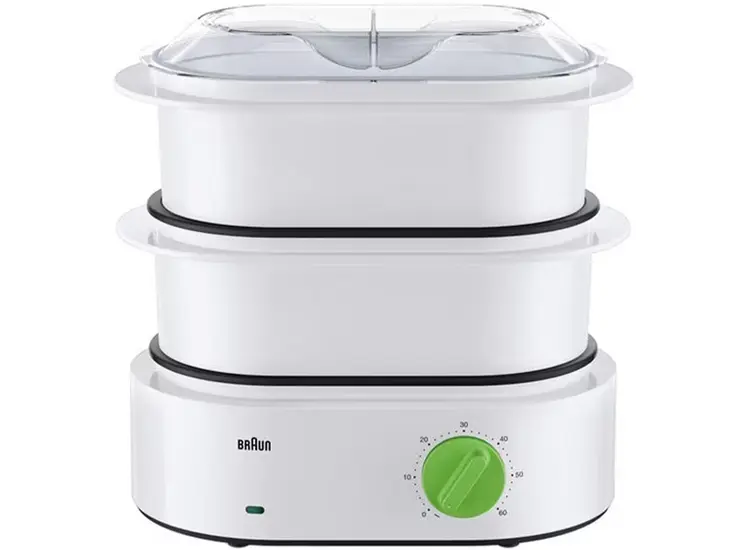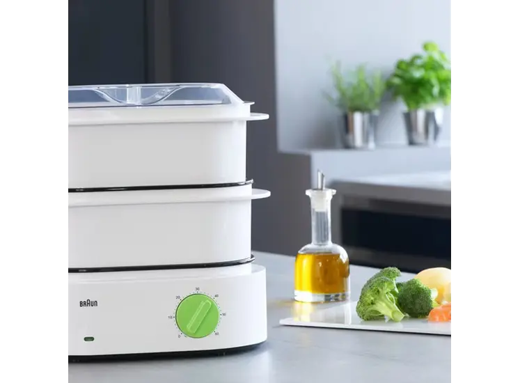 ორთქლსახარში BRAUN FS3000WH იდეალურია ჯანსაღი და ბალანსირებული კვების მოყვარულთათვის. მისი სამსაფეხურიანი კონსტრუქცია და 2 ლიტრიანი წყლის რეზერვუარი საშუალებას გაძლევთ ერთდროულად მოამზადოთ სხვადასხვა სახეობის საკვები. მოწყობილობა ამზადებს საკვებს ცხელი ორთქლით, რაც ინარჩუნებს პროდუქტების ვიტამინებსა და ბუნებრივ არომატს. BPA-სგან თავისუფალი პლასტმასი უსაფრთხოა ბავშვის საკვებისთვისაც. კომპაქტური დიზაინი მარტივია შენახვისთვის, ხოლო მოხსნადი ნაწილები შესაფერისია ჭურჭლის სარეცხი მანქანისთვის. ინტეგრირებული ტაიმერი და ავტომატური გამორთვის ფუნქცია დამატებით კომფორტსა და უსაფრთხოებას უზრუნველყოფს. BRAUN FS3000WH მარტივად გახდება თქვენი ყოველდღიური კულინარიული რუტინის ჯანსაღი ნაწილი.