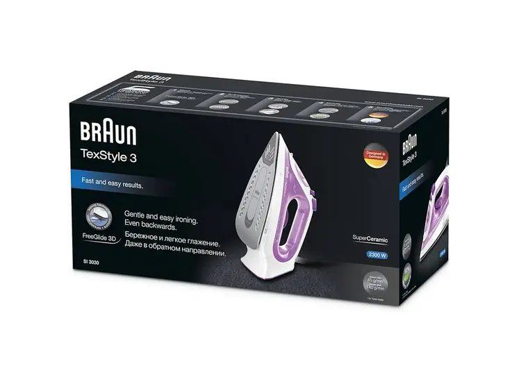 ორთქლის უთო BRAUN SI3030PU აერთიანებს გერმანულ ხარისხს, ინოვაციურ ტექნოლოგიასა და მოხერხებულ დიზაინს. მისი 2300 ვატიანი სიმძლავრე უზრუნველყოფს სწრაფად გათბობას — მაქსიმალურ ტემპერატურაზე მზად არის მხოლოდ 35 წამში. SuperCeramic საფარი და FreeGlide 3D ტექნოლოგია უზრუნველყოფს 360 გრადუსით სრიალს, რაც ამცირებს დაბრკოლებებს ღილაკებთან და ნაკერებთან. 45 გ/წთ მუდმივი ორთქლის გამოყოფა და 140 გ/წთ ორთქლის იმპულსი ეფექტურად აშორებს რთულ ნაოჭებს. 270 მლ მოცულობის წყლის ავზი და თვითწმენდის ფუნქცია ამცირებს ნადების დაგროვებას, რაც უზრუნველყოფს მოწყობილობის ხანგრძლივ მუშაობას. BRAUN SI3030PU იდეალურია ყოველდღიური გამოყენებისთვის, სთავაზობს სისწრაფეს, სიზუსტესა და კომფორტს.
