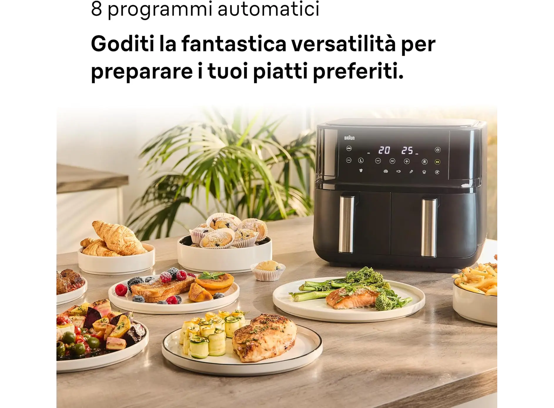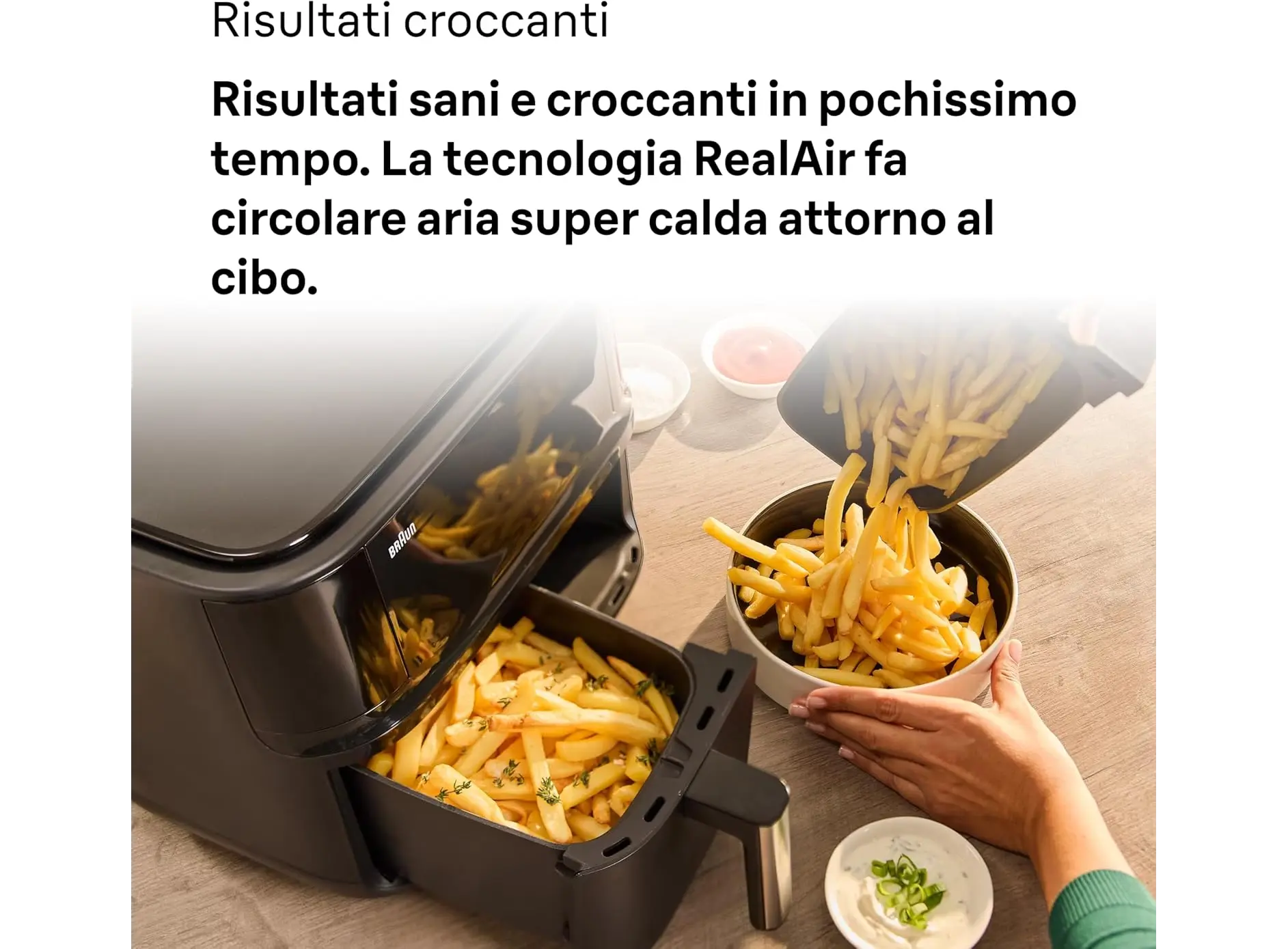 მოდელი აღჭურვილია 4.3 ლიტრიანი კალათით, რაც ოპტიმალურია მცირე ოჯახისთვის ან წყვილისთვის. სენსორული მართვის პანელი 8 წინასწარ დაყენებული პროგრამით (მათ შორის კარტოფილი ფრი, ქათამი, სტეიკი, თევზი) მაქსიმალურად ამარტივებს მოხმარებას. თქვენ ასევე გაქვთ შესაძლებლობა, ხელით დაარეგულიროთ ტემპერატურა 80°C-დან 200°C-მდე და დრო 60 წუთამდე. მიკვრის საწინააღმდეგო ზედაპირი და მოხსნადი ნაწილები კი მარტივად ირეცხება.