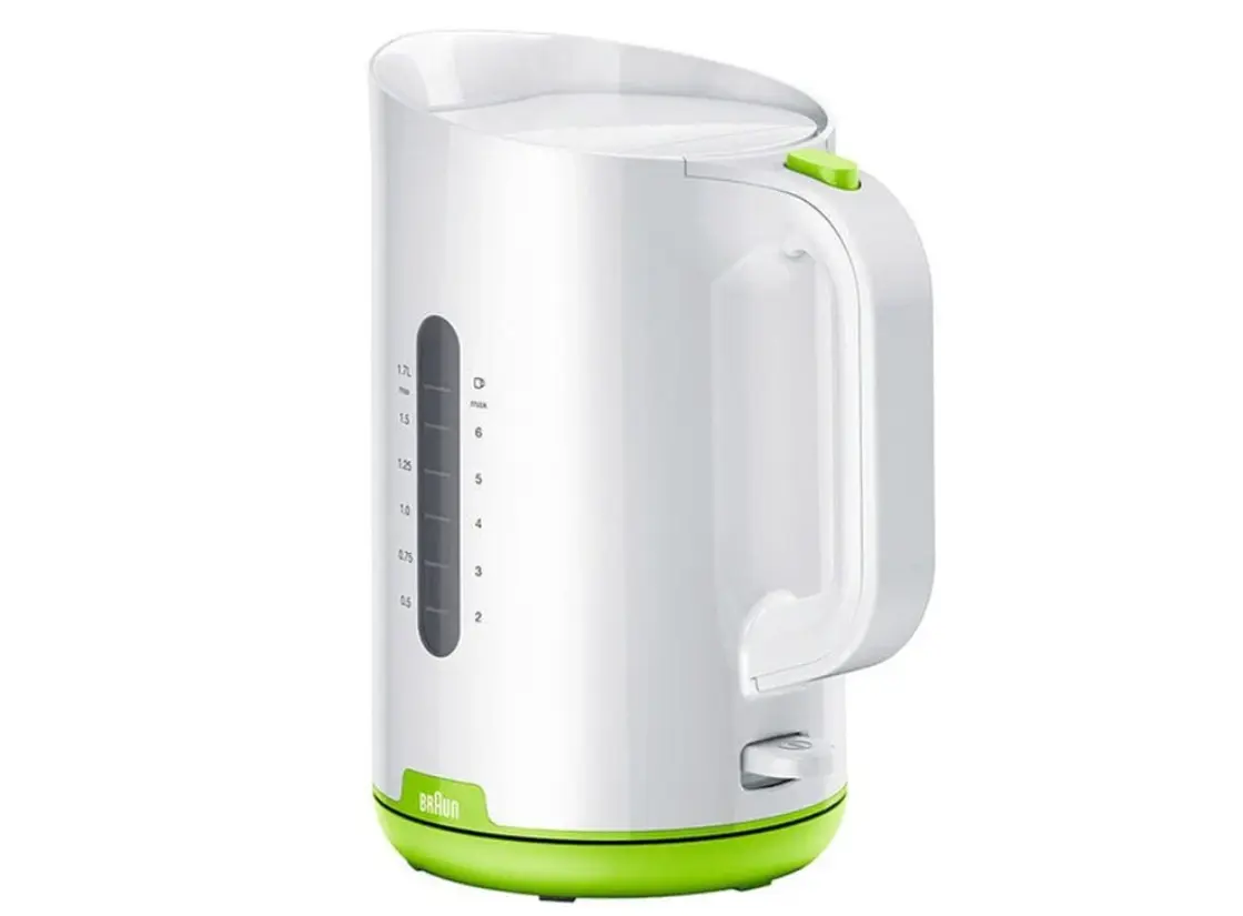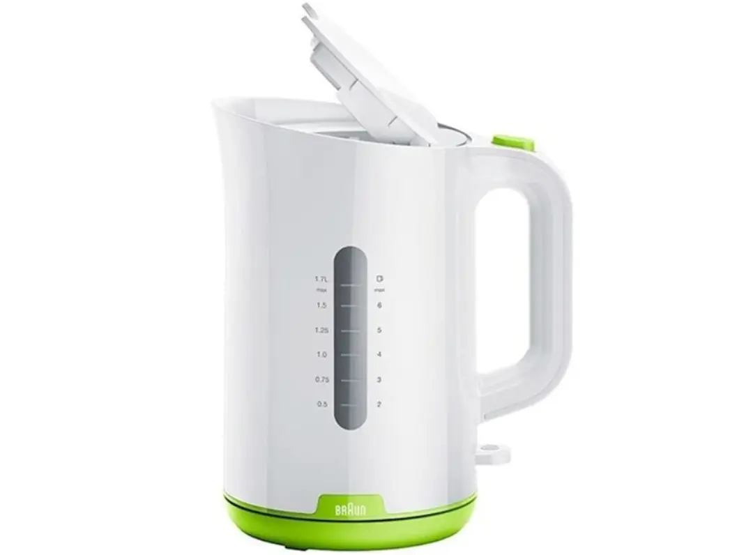 ელექტრო ჩაიდანი BRAUN WK1100GR აერთიანებს ელეგანტურ დიზაინს, ენერგოეფექტურობასა და უსაფრთხოების მაღალ სტანდარტებს. მისი 2200 ვატიანი სიმძლავრე და სწრაფი ადუღების სისტემა საშუალებას გაძლევთ 200 მლ წყალი ადუღოთ მხოლოდ 45 წამში. 1.7 ლიტრიანი მოცულობა იდეალურია როგორც ყოველდღიური, ისე სტუმრების გამასპინძლებისთვის. მოწყობილობა აღჭურვილია 4-დონიანი უსაფრთხოების სისტემით: ავტომატური გამორთვა ადუღების შემდეგ, დაცვა მშრალი მუშაობისგან, გამორთვა ბაზიდან მოხსნისას და სტაბილურობა 15° დახრის შემთხვევაშიც. ფართო წინა გახსნის მეშვეობით წყლის შევსება მარტივია, ხოლო ანტინადების ფილტრი უზრუნველყოფს სუფთა წყალს. 360 გრადუსიანი მბრუნავი ბაზა და კაბელის შესანახი სისტემა ამარტივებს გამოყენებასა და შენახვას. BPA-სგან თავისუფალი პლასტმასის კორპუსი და თეთრი-მწვანე ფერი კი შეესაბამება ნებისმიერ სამზარეულოს ინტერიერს.