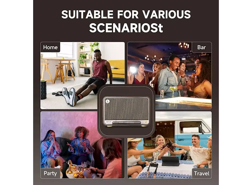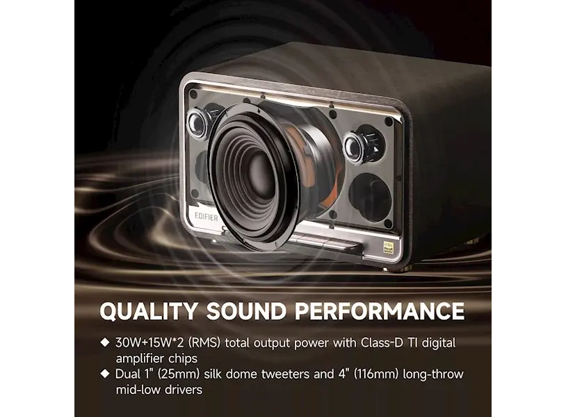 Edifier D32 Tabletop Wireless Speaker Black Walnut არის დახვეწილი და ფუნქციური დინამიკი, რომელიც იდეალურად ერგება როგორც მუსიკის მოყვარულების, ასევე მაღალი ხარისხის აუდიოს მომთხოვნი მომხმარებლების საჭიროებებს. მისი 60W სიმძლავრე უზრუნველყოფს მკვეთრ, დეტალურ და ბალანსირებულ ხმის ხარისხს. Bluetooth ტექნოლოგია იძლევა უსადენო დაკავშირების შესაძლებლობას, ხოლო USB-C და AUX პორტები მრავალფეროვანი მოწყობილობების მარტივად მიერთების საშუალებას. დინამიკი გამოირჩევა Black Walnut-ის ბუნებრივი და ელეგანტური დიზაინით, რომელიც ქმნის კლასიკურ იერსახეს ნებისმიერ ინტერიერში. ეს კომპაქტური და სტილური მოწყობილობა იდეალურია როგორც ყოველდღიური მოსმენისთვის, ასევე განსაკუთრებული მომენტებისთვის.