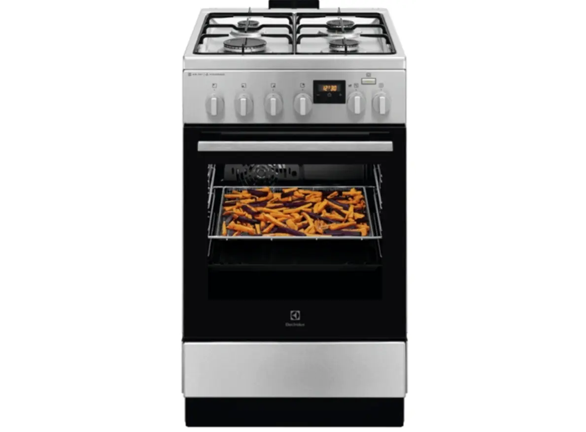 Electrolux LKK560222X არის კომპაქტური და სრულად კომბინირებული (გაზქურა + ელექტრო ღუმელი) მოდელი ყინულისფერი უჟანგავი ფოლადის ზედაპირით. აიღებთ ოთხი გაზის ბრტყელ Burner-ით (ჩართვის ელექტრო Ignite) და 58 ლ ტევადობით ელექტრო ღუმელით კონვექციური + გლიში ფუნქციით. ღუმელი აღჭურვილია თერმოსტატით, ლოდინის და ტაიმერის ფუნქციებით, ღუმელის განათებით და მარტივად გასაწმენდ Enamel Easy Clean საფარით. ენერგოეფექტურობის კლასი არის A, რაც უზრუნველყოფს დაბალ მოხმარებას. ჩასართავად ზომები — 85.5×50×60 სმ; წონა — დაახლოებით 44 კგ. მოდელი ორიენტირებულია ყოველდღიურ სამზარეულო გამოყენებაზე — მარტივი მართვა მექანიკური ბორბლებებით და უსაფრთხოების კომპონენტებით.
