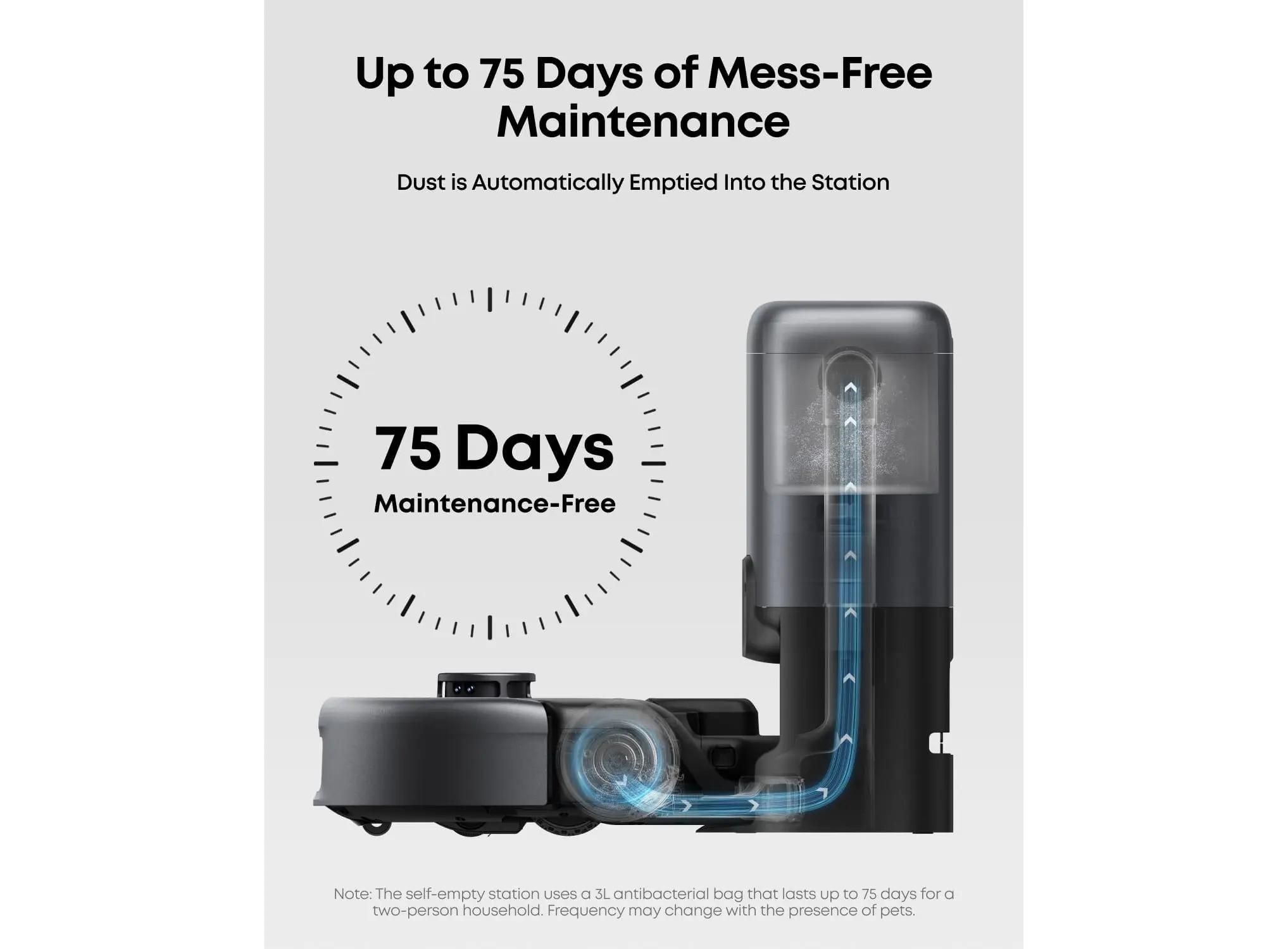 - თვითდაცლა: მტვერს ავტომატურად ტუმბავს ბაზის ტომარაში (იტევს დაახლოებით 2 თვის ნაგავს).
