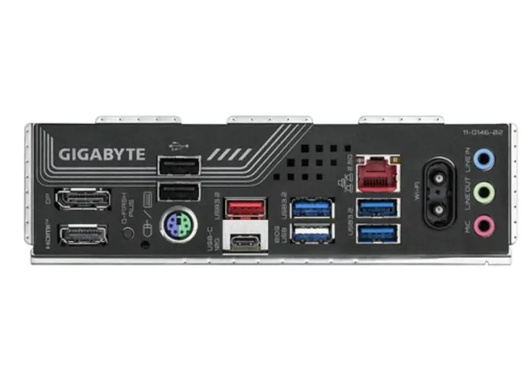 - უკანა I/O პორტები: 3 x USB 3.2 Gen 1 ports, 1 x PS/2 keyboard/mouse port, 1 x Q-Flash Plus button, 2 x antenna connectors (2T2R), 1 x LAN (RJ-45), 3 x audio jacks, 1 x HDMI, 1 x USB Type-C® port, with USB 3.2 Gen 2 support, 1 x DisplayPort, 3 x USB 2.0/1.1 ports, 1 x USB 3.2 Gen 2 Type-A port (red)