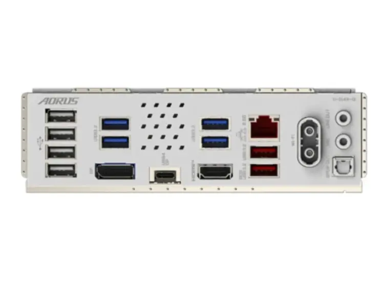 - უკანა I/O პორტები: 2 x USB 3.2 Gen 2 Type-A ports (red), 1 x DisplayPort, 2 x audio jacks, 4 x USB 3.2 Gen 1 ports, 1 x LAN (RJ-45), 2 x antenna connectors (2T2R), 4 x USB 2.0/1.1 ports, 1 x HDMI, 1 x optical S/PDIF Out connector