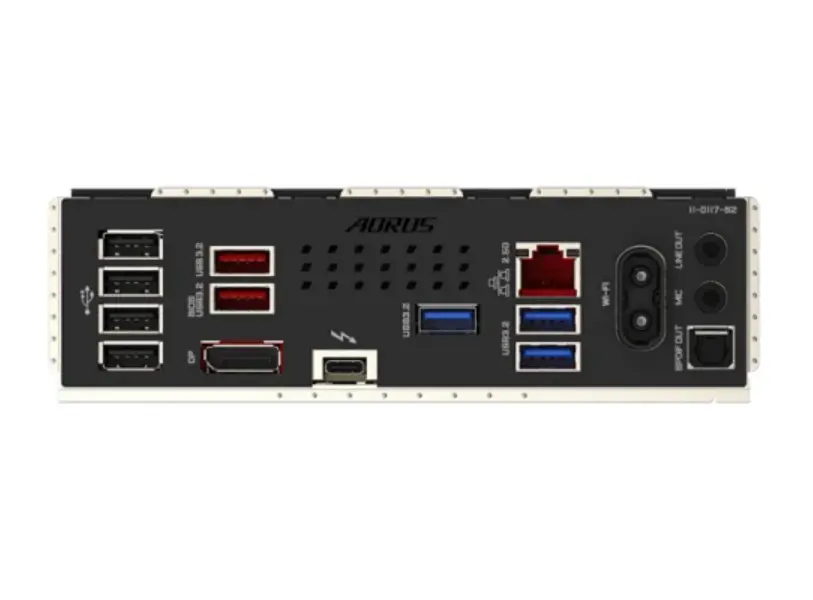 - უკანა I/O პორტები: 2 x audio jacks, 2 x USB 3.2 Gen 2 Type-A ports (red), 1 x LAN (RJ-45), 2 x antenna connectors (2T2R), 4 x USB 2.0/1.1 ports, 1 x DisplayPort, 1 x optical S/PDIF Out connector, 1 x Intel® Thunderbolt™ 4 (Note 2) connector (USB4® USB Type-C® port), 3 x USB 3.2 Gen 1 ports