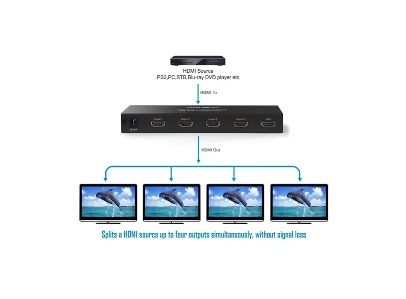 - როგორიცაა Android TV Box, PC, Laptop, PS3 და სხვა, ერთდროულად დაკავშირებული 4 დისპლეის ეკრანთან