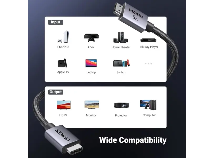 UGREEN HD171 (25908) არის 8K HDMI to HDMI კაბელი, რომელიც უზრუნველყოფს ულტრა-მკვეთრ გამოსახულებას 8K@60Hz და 4K@120Hz გარჩევადობით. HDR, Dolby Vision და eARC მხარდაჭერა უზრუნველყოფს უმაღლესი ხარისხის ვიზუალურ და აუდიო გამოცდილებას, რაც მას იდეალურ აქსესუარად აქცევს გეიმინგისთვის, სახლის კინოთეატრისთვის და პროფესიონალური გამოყენებისთვის. მაღალი გამტარობის სპილენძის ბირთვი, ორმაგი ეკრანირება და გამძლე ნაქსოვი კაბელი უზრუნველყოფს სტაბილურ სიგნალის გადაცემას და ხანგრძლივ გამძლეობას. 1 მეტრიანი სიგრძე იდეალურია მოკლე მანძილზე მაღალი ხარისხის კავშირის უზრუნველსაყოფად.