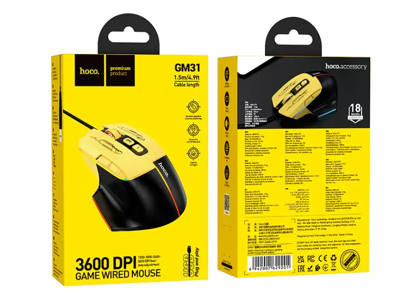 HOCO GM31 Overlord Luminous Gaming მაუსი შავი და ყვითელი ფერების კომბინაციით შექმნილია გეიმერებისთვის, რომლებიც ეძებენ სიზუსტესა და კომფორტს. მისი ერგონომიული დიზაინი და მსუბუქი კონსტრუქცია (110 გ) უზრუნველყოფს ხანგრძლივ თამაშს დაღლილობის გარეშე. 7 ღილაკი და 1200-დან 3600 DPI-მდე რეგულირებადი მგრძნობელობა საშუალებას გაძლევთ მოირგოთ მაუსი თქვენს სათამაშო სტილზე. RGB განათება კი დამატებით ვიზუალურ ეფექტს სძენს თქვენს სამუშაო სივრცეს. USB კავშირი უზრუნველყოფს სტაბილურ და სწრაფ რეაქციას, რაც აუცილებელია დინამიური თამაშებისთვის. მაუსი თავსებადია Windows და macOS სისტემებთან, რაც მას უნივერსალურ არჩევანად აქცევს.