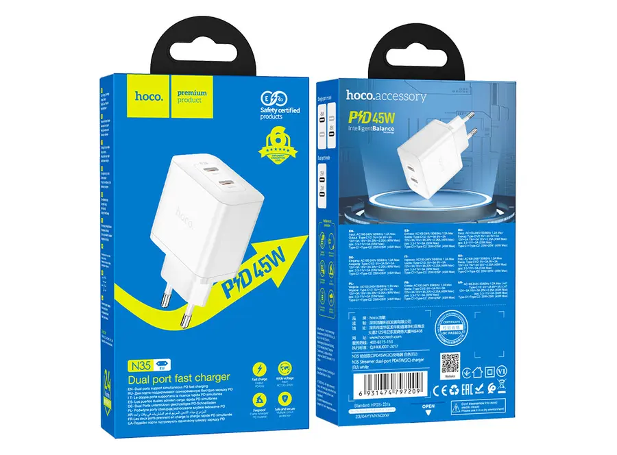 Hoco N35 Streamer ორმაგი პორტის PD45W ადაპტერი უზრუნველყოფს სწრაფ და უსაფრთხო დატენვას თანამედროვე მოწყობილობებისთვის. მისი ორმაგი USB-C პორტები საშუალებას გაძლევთ ერთდროულად დატენოთ ორი მოწყობილობა, რაც მეტად მოსახერხებელია დატვირთული დღის რეჟიმისთვის. PD45W სიმძლავრე უზრუნველყოფს სწრაფი დატენვის მხარდაჭერას, რაც იდეალურია სმარტფონების, ტაბლეტებისა და სხვა მოწყობილობებისთვის. კომპაქტური და მსუბუქი დიზაინი ადვილად თავსდება ჩანთაში ან ჯიბეში, რაც ამარტივებს ტრანსპორტირებას. მოწყობილობა აღჭურვილია უსაფრთხოების მრავალ დონეზე დაცვით, რაც იცავს მას გადატვირთვისა და გადახურებისგან. Hoco N35 Streamer არის თანამედროვე და პრაქტიკული არჩევანი ყოველდღიური გამოყენებისთვის.
