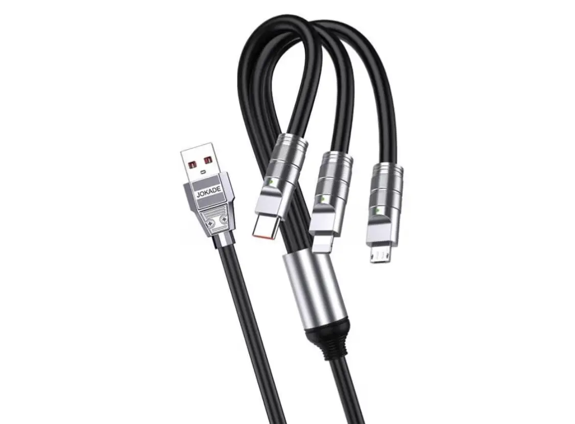 გაამარტივეთ თქვენი ციფრული ცხოვრება Jokade-ს მრავალფუნქციური „3-ერთში“ კაბელით. ეს უნივერსალური აქსესუარი აერთიანებს Lightning, USB-C და Micro USB კონექტორებს, რაც საშუალებას გაძლევთ ერთი კაბელით დატენოთ თითქმის ნებისმიერი თანამედროვე მოწყობილობა — სმარტფონი, პლანშეტი თუ პორტატული ტექნიკა. 3A მაქსიმალური გამტარუნარიანობა უზრუნველყოფს სწრაფ და სტაბილურ დატენვას, რაც მნიშვნელოვნად ზოგავს თქვენს დროს. კაბელი დამზადებულია მაღალი ხარისხის გამძლე მასალისგან, რომელიც მდგრადია გადახლართვისა და ფიზიკური დაზიანების მიმართ, რაც მის ხანგრძლივ ექსპლუატაციას გარანტირებს. დახვეწილი დიზაინი და კომპაქტური ფორმა მას იდეალურს ხდის როგორც სახლში გამოსაყენებლად, ისე მგზავრობისას, რადგან აღარ მოგიწევთ რამდენიმე სხვადასხვა კაბელის ტარება. აირჩიეთ პრაქტიკულობა და ხარისხი ერთ მოწყობილობაში.