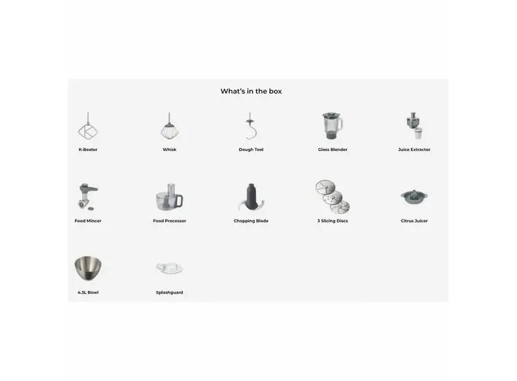 - კომპლექტაციაშია: K-beater, Whisk, Dough tool, Food processor, Glass jug, Citrus juicer, Mini chopper, Mincer, 3x slicing discs, Weight scale, Centrifugal juicer