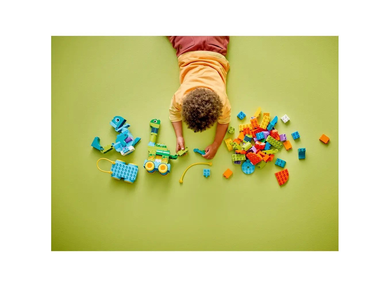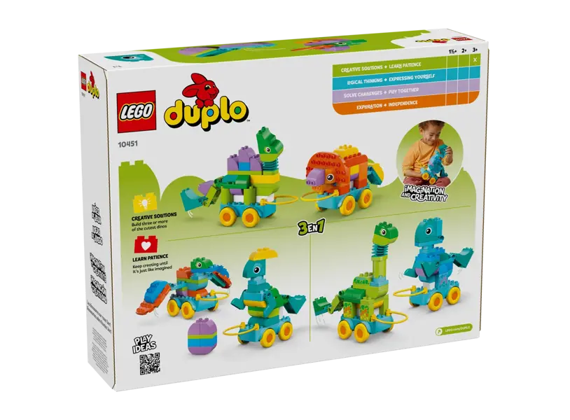 ლეგო LEGO Constructor DUPLO Town 3in1 Dinosaurs on Wheels არის საგანმანათლებლო და სახალისო კონსტრუქტორი, რომელიც ყველაზე პატარა მშენებლებისთვისაა შექმნილი. ამ სეტში შედის სამი სხვადასხვა სახის დინოზავრის აწყობის შესაძლებლობა – თითოეული მათგანი მოძრავი ბორბლებით, რაც თამაშს კიდევ უფრო ინტერაქტიულს ხდის. დიდი ზომის, ფერადი და უსაფრთხო ბლოკები ადვილად იკრიბება და უზრუნველყოფს ბავშვის ინტერესის მუდმივ შენარჩუნებას. კონსტრუქტორი ხელს უწყობს მოტორული უნარების განვითარებას, ფანტაზიის გაღრმავებას და ლოგიკური აზროვნების გაძლიერებას. LEGO DUPLO-ს ხარისხიანი მასალები უსაფრთხო და გამძლეა, ამიტომ თამაში შეიძლება ყოველდღიურად და ხანგრძლივი დროით. Dinosaurs on Wheels არის იდეალური საჩუქარი preschool ასაკის ბავშვებისთვის, რომლებიც დინოზავრებით, ფერადი ფიგურებითა და მოძრავი კონსტრუქციებით სიამოვნებას იღებენ. მშობლებისთვის კი ეს კონსტრუქტორი სასიამოვნო საშუალებაა ბავშვებთან ერთად შემოქმედებითი თამაშისთვის.