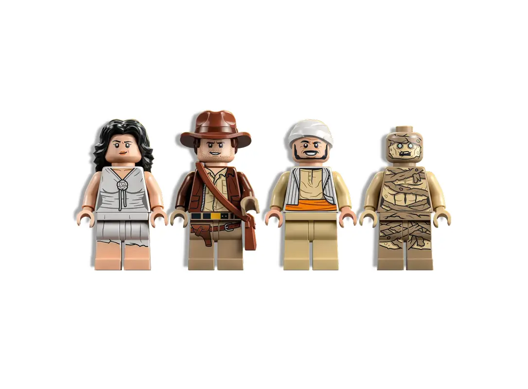- 4 მინიფიგურა: ინდიანა ჯონსი თავისი ცნობილი ქუდით და მათრახით, მარიონ რევენვუდი, სალა და მუმია