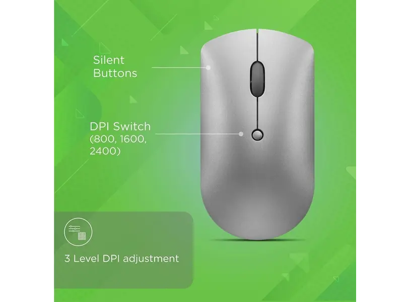 Lenovo 600 Bluetooth Silent Mouse (GY50X88832) Iron Grey ფერში არის მონდომებული არჩევანი მინიმალისტური და ეფექტური გადაადგილებისთვის. მას აქვს Bluetooth 5.0 მხარდაჭერა Microsoft Swift Pair-ით, რაც საშუალებას იძლევა დაუკავშიროთ და სწრაფად გადართოთ ორი მოწყობილობა ერთი ღილაკის ასწორებით. Blue optical სენსორი უზრუნველყოფს ზუსტ ტრეკინგს და მუშაობს כמעט ნებისმიერ ზედაპირზე დარტყმის გარეშე. დანიის three‑level DPI რეგულირების ხარჯზე (800, 1600, 2400 DPI) ადვილად მართავთ კურსორის სიჩქარეს. Silent buttons ტექნოლოგია ამცირებს ხმაურს და უზრუნველყოფს სამუშაო სივრცეში კომფორტს. კომპაქტური, მსუბუქი წონა (2.15 oz / 61 გ) და low‑profile დიზაინი საშუალებას გაძლევთ მიიტანოთ ჩანთაში მარტივად. AA ბატარეის ცხოვრება შეიძლება გაგრძელდეს 12 თვის განმავლობაში ერთი ბატარეით. იდეალურია ოფისში, მოგზაურობაში ან სახლში გამოყენებისთვის – კომფორტიც და აგრეთვე სიჩუმეც ერთ მოწყობილობაში.