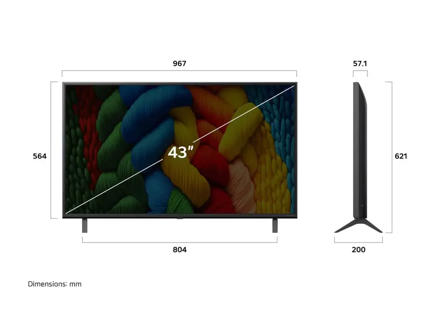 - ზომები სადგამის გარეშე: 96.7 x 56.4 x 5.71 cm