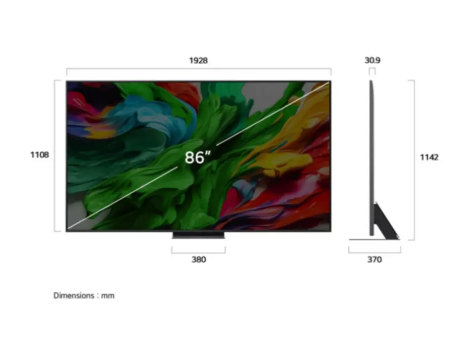 - ზომები სადგამის გარეშე: 110.8 x 192.8 x 3.09 cm