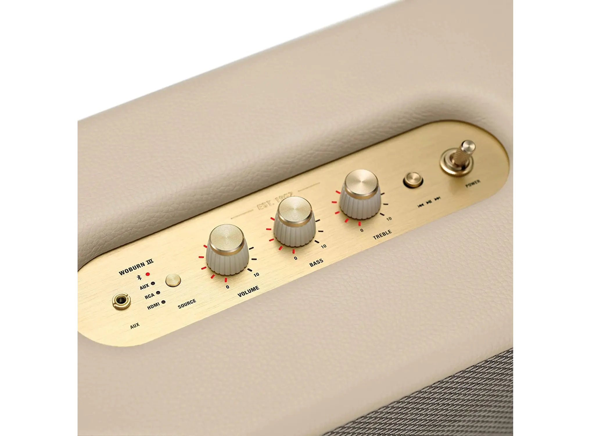 • ზედა პანელის ღილაკები:Source button, Volume control knob, Bass control knob, Treble control knob, Play/Pause button, Skip backward/forward control knob, Power switch