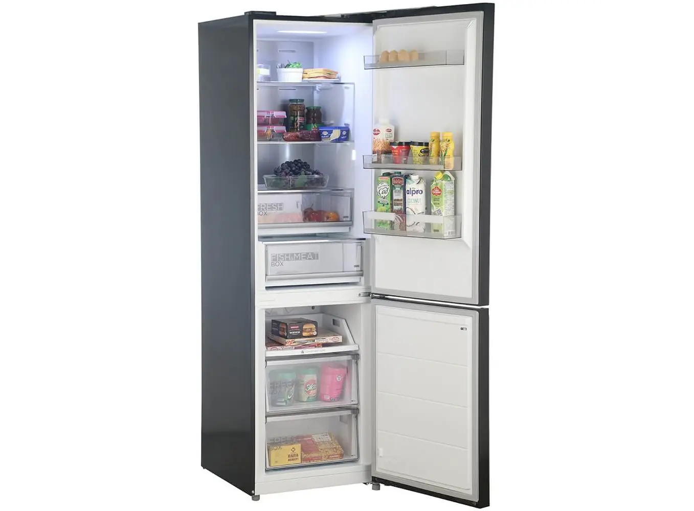 Midea MDRB521MGE22ODM არის თანამედროვე და ენერგოეფექტური მაცივარი, რომელიც გთავაზობთ 360 ლიტრიან საერთო მოცულობას, რაც იდეალურია საშუალო და დიდი ოჯახებისთვის. მისი ენერგოეფექტურობის კლასი A++ უზრუნველყოფს დაბალ ენერგომოხმარებას და ეკოლოგიურად სუფთა მუშაობას. მაცივარი აღჭურვილია No Frost ტექნოლოგიით, რაც ხელს უშლის ყინულის დაგროვებას და ამარტივებს მოვლას. შავი ფერი და ელეგანტური დიზაინი მაცივარს თანამედროვე იერს აძლევს, რომელიც მარტივად ერგება ნებისმიერ სამზარეულოს ინტერიერს. მისი ზომებია: სიმაღლე 185 სმ, სიგანე 60 სმ, სიღრმე 65 სმ, რაც საშუალებას გაძლევთ ეფექტურად გამოიყენოთ სივრცე. მაცივარი ასევე აღჭურვილია LED განათებით, რაც უზრუნველყოფს შიდა სივრცის ნათელ და ენერგოეფექტურ განათებას. რეგულირებადი თაროები და ფართო კარის ჯიბეები საშუალებას გაძლევთ ორგანიზებულად მოათავსოთ სხვადასხვა ზომის პროდუქტები. მაცივრის ქვედა ნაწილში განთავსებული საყინულე განყოფილება უზრუნველყოფს საკვების ხანგრძლივ შენახვას საჭირო ტემპერატურაზე.