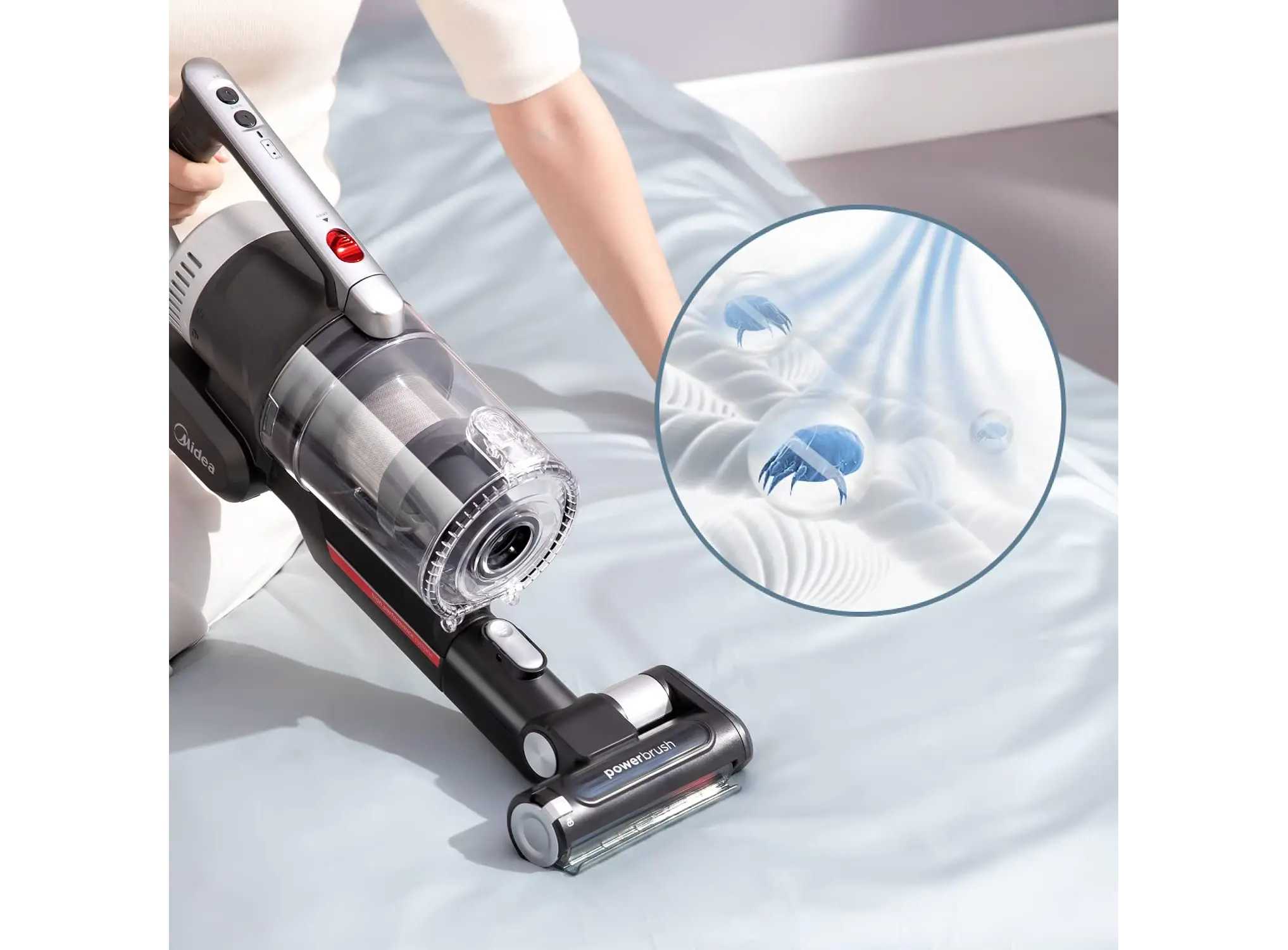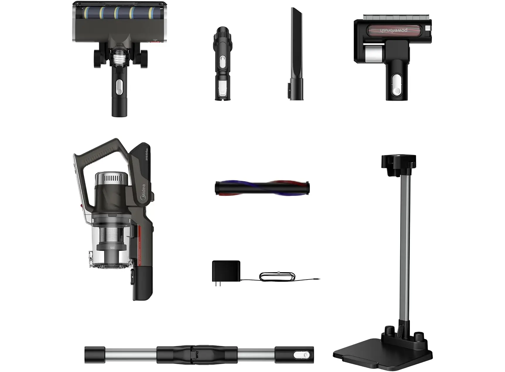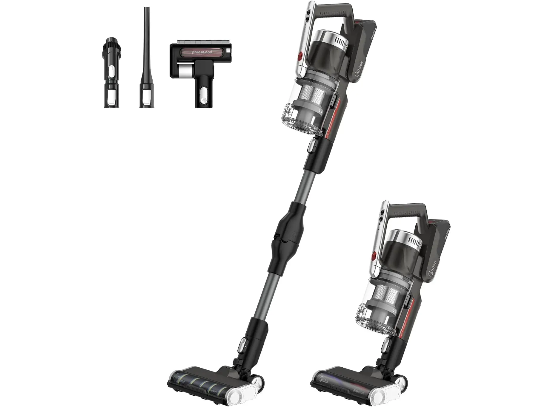 Midea P7 MCS2129BR (P7 Flex) არის უსადენო, 2‑in‑1 სტიკ და ხელით მოსაკიდი მტვერსასრუტი სწრაფი ჩართვით და ბენდავშებადი მილით. აღჭურვილია ძლიერი 450 W BLDC ძრავით, რომელიც შეუძლია შექმნას 150 AW მძლავრი დახრილი მოზიდვა (25 000 Pa). მუშაობის დრო ერთ დამუხტვაზე — დაახლოებით 70 წუთი, რაც იძლევა ვრცელი ფართების ერთჯერად კონტაქტს. მოწყობილობა იწონის მხოლოდ ≈2.3 კგ, რაც კომფორტულ და მობილურ ექსპლუატაციას უზრუნველყოფს. აქვს ოთხ სტადიიანი HEPA ფილტრაცია და 0.65 ლ მოცულობის მტვრის კონტეინერი ანტიბაქტერიული მასალით. LED განათება საშუალებას იძლევა კარგად დაინახოთ მუქ კუთხეები, მცირე ელემენტების დეტალური გაწმენდა. კომპლექტში შედის ორი განსხვავებული როლერი (ხალიჩისთვის და მყარ იატაკისთვის), ათვალზე დასადგამი საწყობი, ჯავშის ჯაგრისი და დანარჩენი გამოცოცხალ დასუფთავებაზე ორიენტირებული აქსესუარები. ხმაურის დონე ≈79 dB, დამუხტვის დრო – დაახლოებით 6 საათი. მოდელი განსაკუთრებით გამოსადეგია მყარი ჭერის, ავეჯის ქვეშ და მატრასებისათვის.