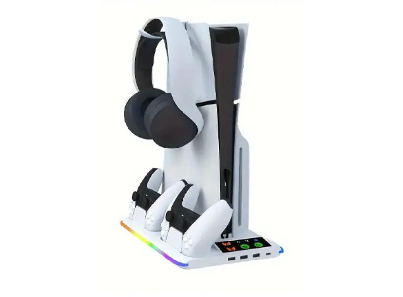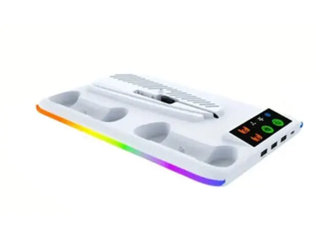 OTVO Playstation 5 Cooling Stand with Controller Charger არის მრავალფუნქციური აქსესუარი, რომელიც აერთიანებს PS5 კონსოლის გამაგრილებელ სისტემასა და კონტროლერების დამტენს. სტენდს აქვს ჩაშენებული ორმაგი ვენტილატორი, რომელიც ეფექტურად ამცირებს კონსოლის ტემპერატურას და იცავს გადახურებისგან ინტენსიური თამაშის დროს. მოწყობილობას შეუძლია ერთდროულად ორი კონტროლერის დატენვა და უზრუნველყოფს მათ უსაფრთხო შენახვას. დამტენი აღჭურვილია LED ინდიკატორებით, რომლებიც აჩვენებენ დატენვის სტატუსს. OTVO Cooling Stand ასევე მოიცავს დამატებით სივრცეს დისკების მოსათავსებლად, რაც აადვილებს სათამაშო სივრცის ორგანიზებას. კომპაქტური და სტაბილური დიზაინი უზრუნველყოფს კონსოლის უსაფრთხო და მარტივ მოთავსებას.