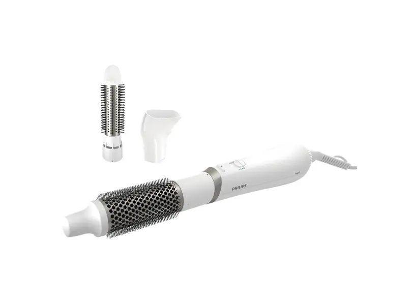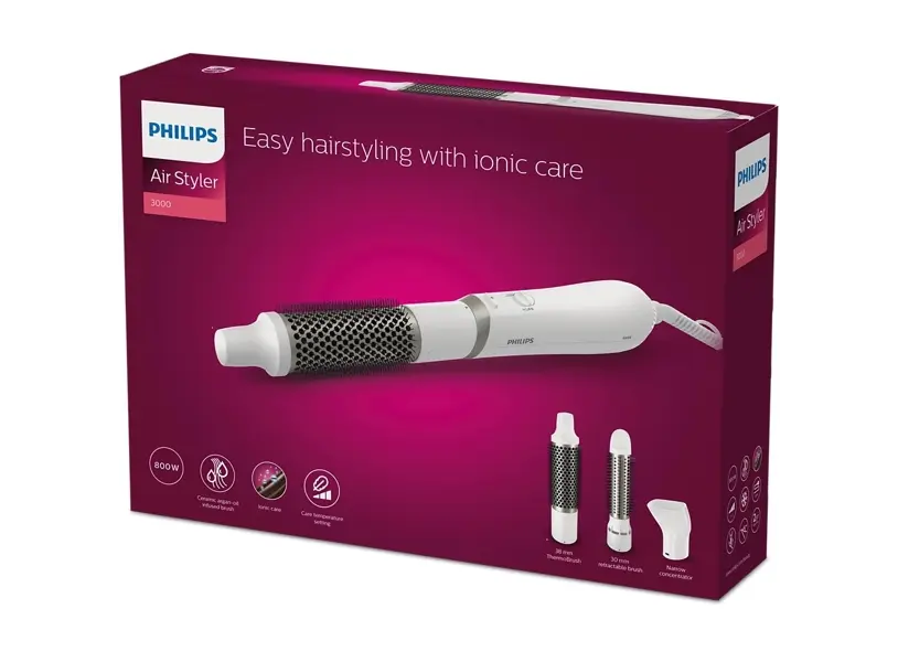 თმის საშრობი PHILIPS BHA303/00 3000 სერიის აეროსტაილერი აერთიანებს გაშრობისა და სტილიზაციის ფუნქციებს, რაც საშუალებას გაძლევთ შექმნათ ბუნებრივი და ბზინვარე ვარცხნილობები. მოწყობილობა აღჭურვილია 800 ვატიანი სიმძლავრით და სამი ცვლადი საცმით: 38 მმ თერმო ჯაგრისი ტალღოვანი სტილისთვის, 30 მმ ჯაგრისი შემოსაწევი ჯაგრებით დახვეწილი ტალღებისთვის და ვიწრო კონცენტრატორი ზუსტი სტილიზაციისთვის. იონიზაციის ტექნოლოგია ამცირებს სტატიკურ ელექტრობას და აძლევს თმას ბზინვარებას. არგანის ზეთით გაჟღენთილი კერამიკული საფარი უზრუნველყოფს თმის დაცვასა და ბზინვარებას. მოწყობილობა გთავაზობთ სამ სიჩქარესა და ტემპერატურის რეჟიმს, მათ შორის "Care" რეჟიმს თმის გადახურებისგან დასაცავად და "Cool Air" რეჟიმს ნაზი გაშრობისთვის. 1.8 მეტრიანი მბრუნავი კაბელი და ჩამოსაკიდი მარყუჟი უზრუნველყოფს მოხერხებულ გამოყენებას. PHILIPS BHA303/00 იდეალურია მათთვის, ვინც ეძებს მრავალფუნქციურ და თმისთვის მზრუნველ სტილიზაციის მოწყობილობას.