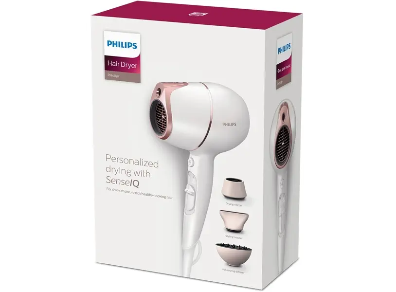 Philips BHD628/00 Prestige არის პრემიუმ კლასის თმის საშრობი, რომელიც აღჭურვილია SenseIQ ტექნოლოგიით. ინტეგრირებული ინფრაწითელი სენსორი მუდმივად აკონტროლებს თმის ტემპერატურას და ავტომატურად არეგულირებს ჰაერის სითბოს, რაც იცავს თმას გადახურებისგან და ინარჩუნებს მის ბუნებრივ ტენიანობას. 1800 ვატიანი სიმძლავრე და 20%-ით უფრო სწრაფი გაშრობის შესაძლებლობა უზრუნველყოფს ეფექტურ და სწრაფ შედეგს. მოწყობილობას აქვს 3 ტემპერატურის რეჟიმი, 2 სიჩქარე და Cool Shot ფუნქცია. კომპლექტში შედის სტანდარტული საშრობი პირი, 11 მმ სტაილინგის პირი და დიფუზორი, რაც საშუალებას გაძლევთ შექმნათ სხვადასხვა ვარცხნილობა. იონიზაციის ფუნქცია ამცირებს თმის ფაფუკობას და უზრუნველყოფს ბზინვარებას. მსუბუქი და კომპაქტური დიზაინი, 2 მეტრიანი კაბელი და ჩამოსაკიდი კაუჭი უზრუნველყოფს კომფორტულ გამოყენებას და შენახვას.