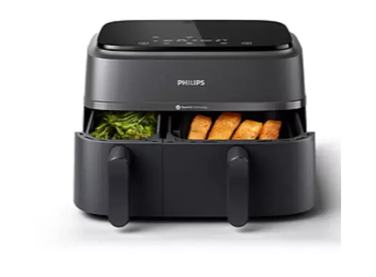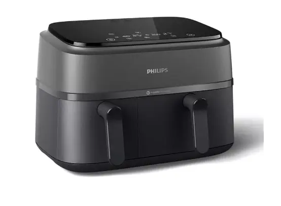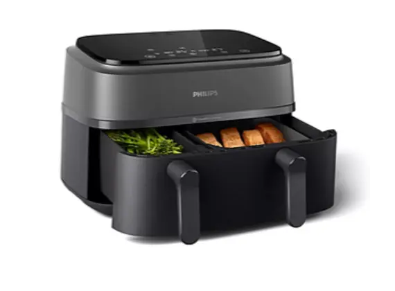 Philips NA350/00 3000 სერიის ორმაგი კალათის აეროგრილი იდეალურია მათთვის, ვისაც სურს სწრაფი, ჯანსაღი და მრავალფეროვანი მომზადება. მისი 9 ლიტრიანი საერთო ტევადობა (6 ლიტრი ძირითადი და 3 ლიტრი დამატებითი კალათა) საშუალებას გაძლევთ ერთდროულად მოამზადოთ ძირითადი კერძი და გარნირი. Rapid Air Plus ტექნოლოგია უზრუნველყოფს ცხელი ჰაერის თანაბარ ცირკულაციას, რაც იძლევა ხრაშუნა და თანაბრად მომზადებულ საკვებს 90%-ით ნაკლები ცხიმით. მოწყობილობა აღჭურვილია 8 წინასწარ დაპროგრამებული რეჟიმით, რაც ამარტივებს სხვადასხვა ტიპის საკვების მომზადებას. სინქრონიზაციის ფუნქცია უზრუნველყოფს ორივე კალათის ერთდროულად დასრულებას, ხოლო "Copy" ფუნქცია საშუალებას გაძლევთ დააკოპიროთ დრო და ტემპერატურა ორივე კალათისთვის. Touchscreen პანელი და HomeID აპლიკაცია უზრუნველყოფს მარტივ მართვას და მრავალფეროვან რეცეპტებს. კალათები ადვილად იწმინდება და შესაძლებელია მათი ჭურჭლის სარეცხ მანქანაში მოთავსება.