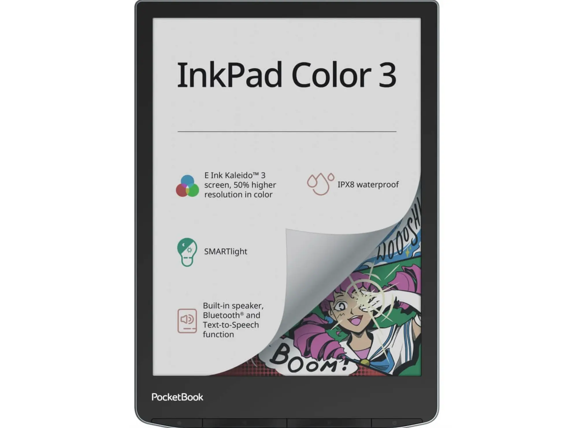 აღმოაჩინეთ კითხვის სრულიად ახალი სამყარო PocketBook InkPad Color 3 ელექტრონული წიგნის მეშვეობით. ეს დახვეწილი Stormy Sea ფერის მოწყობილობა აღჭურვილია უახლესი 7.8 ინჩიანი E Ink Kaleido 3 ფერადი ეკრანით, რაც უზრუნველყოფს ილუსტრაციების, კომიქსებისა და ჟურნალების საოცარ ვიზუალიზაციას თვალებისთვის უსაფრთხო რეჟიმში. IPX8 წყალგამძლეობის სტანდარტი საშუალებას გაძლევთ ისიამოვნოთ კითხვით ნებისმიერ გარემოში, იქნება ეს აუზი თუ აბაზანა. ჩაშენებული დინამიკი და Bluetooth მხარდაჭერა საშუალებას გაძლევთ მოუსმინოთ აუდიოწიგნებს ყოველგვარი შეფერხების გარეშე. SMARTlight ტექნოლოგია კი ავტომატურად არეგულირებს განათების ტონალობასა და სიკაშკაშეს დღის ნებისმიერ მონაკვეთში კომფორტული კითხვისთვის. მსუბუქი კონსტრუქცია და მძლავრი ელემენტი ამ მოდელს იდეალურ მეგზურად აქცევს ხანგრძლივი მოგზაურობისას. გაიმარტივეთ წვდომა ათასობით წიგნზე და ისიამოვნეთ თანამედროვე ტექნოლოგიების უპირატესობით. შეიძინეთ PocketBook-ის ხარისხი და გახადეთ კითხვა უფრო სასიამოვნო.
