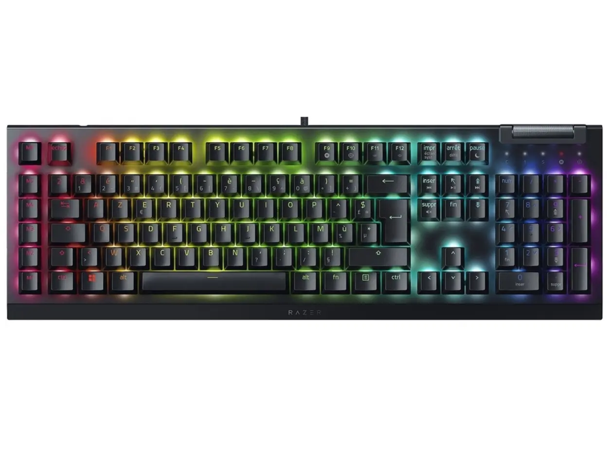 კლავიატურა Razer BlackWidow V4 X, 110key, Yellow Switch, USB-A, EN/RU, RGB, black არის პროფესიონალური მექანიკური კლავიატურა, რომელიც შექმნილია გეიმერებისა და აქტიური მომხმარებლებისთვის. 110 ღილაკიანი სრული ფორმატი უზრუნველყოფს სრულფასოვან კონტროლს, ხოლო EN/RU განლაგება მოხერხებულს ხდის მის გამოყენებას მრავალენოვან გარემოში. Yellow Switch მექანიკური სვიჩები გამოირჩევა რბილი და სწრაფი რეაქციით, რაც იდეალურია თამაშებისთვის და ხანგრძლივი მუშაობისთვის. USB-A კავშირი უზრუნველყოფს სტაბილურ და მყისიერ სიგნალს, ხოლო ინტეგრირებული RGB განათება Razer Chroma ტექნოლოგიით გთავაზობთ მილიონობით ფერის კომბინაციასა და პერსონალიზაციის საშუალებას. გამძლე შავი კორპუსი და მაღალი ხარისხის მასალები ამ კლავიატურას ხდის საიმედოსა და გამძლეს ინტენსიური გამოყენებისას. Razer BlackWidow V4 X არის საუკეთესო არჩევანი მათთვის, ვინც ეძებს სიჩქარეს, სიზუსტესა და ელეგანტურ დიზაინს ერთ მოწყობილობაში.