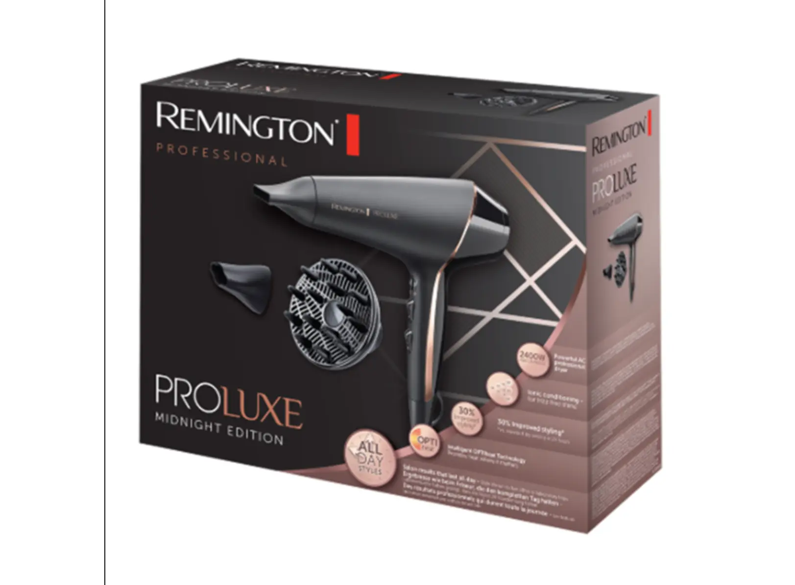 აღმოაჩინეთ პროფესიონალური მოვლის ახალი სტანდარტი Remington-ის თმის საშრობით AC9140B Midnight Edition. PROluxe სერიის ეს ელეგანტური მოდელი აღჭურვილია მძლავრი 2400-ვატიანი AC ძრავით, რომელიც უზრუნველყოფს ჰაერის მუდმივ და ძლიერ ნაკადს სალონური შედეგისთვის. ინოვაციური OPTIheat ტექნოლოგია ჭკვიანურად ანაწილებს სითბოს იქ, სადაც ეს ყველაზე მეტად საჭიროა, რაც საშუალებას გაძლევთ შექმნათ ვარცხნილობა, რომელიც 24 საათის განმავლობაში ინარჩუნებს ფორმას. იონური კონდიცირების სისტემა 90%-ით მეტი იონით ეფექტურად ებრძვის თმის დაელექტროებას და ანიჭებს მას განსაკუთრებულ აბრეშუმისებრ ბზინვარებას. მოწყობილობას აქვს ტემპერატურისა და სიჩქარის რამდენიმე რეჟიმი, ხოლო სპეციალური Style Shot ფუნქცია უზრუნველყოფს მიღებული ფორმის ხანგრძლივ ფიქსაციას. კომპლექტში შემავალი პროფესიონალური კონცენტრატორი და დიფუზორი დაგეხმარებათ ნებისმიერი სირთულის ვარცხნილობის მარტივად შექმნაში. შეიძინეთ Remington-ის პრემიუმ ხაზის სტაილერი და ისიამოვნეთ ჯანსაღი და მოვლილი თმით. დაამატეთ პროდუქტი კალათაში და ისარგებლეთ საუკეთესო პირობებით.