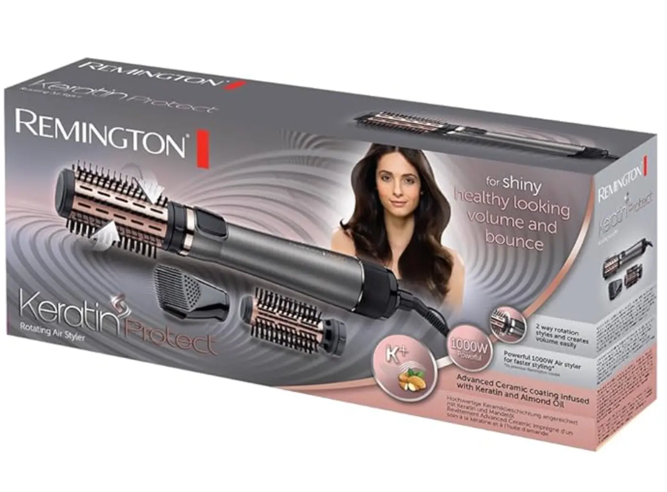 Remington-ის ინოვაციური თმის სტაილერი Keratin Protect სერიიდან შექმნილია მათთვის, ვისაც სურს პროფესიონალური მოცულობა და ბზინვარება თმის მაქსიმალური დაცვით. მოწყობილობა აღჭურვილია მოწინავე კერამიკული საფარით, რომელიც გაჟღენთილია კერატინისა და ნუშის ზეთის მიკროკონდიციონერებით. გაცხელებისას ეს ნივთიერებები თანაბრად გადადის თმაზე, რაც უზრუნველყოფს მის გაჯანსაღებას და ანიჭებს მას განსაკუთრებულ აბრეშუმისებრ სირბილეს. 1000 ვატი სიმძლავრე საშუალებას გაძლევთ ერთდროულად გაიშროთ და დაიყენოთ თმა, რაც საგრძნობლად ზოგავს დროს. ორმხრივი ბრუნვის ფუნქცია და კომპლექტში შემავალი სხვადასხვა ზომის ჯაგრისები საშუალებას გაძლევთ შექმნათ როგორც დიდი მოცულობის ხვეულები, ისე ბუნებრივი ტალღები. სტაილერს აქვს ტემპერატურისა და სიჩქარის რამდენიმე რეჟიმი, რაც მას იდეალურს ხდის ნებისმიერი ტიპის თმისთვის. ცივი ჰაერის ფუნქცია კი დაგეხმარებათ ვარცხნილობის ფორმის ხანგრძლივ ფიქსაციაში. შეიძინეთ Remington-ის მრავალფუნქციური სტაილერი და ისიამოვნეთ სალონური ეფექტით სახლის პირობებში. დაამატეთ კალათაში და ისარგებლეთ საუკეთესო პირობებით.