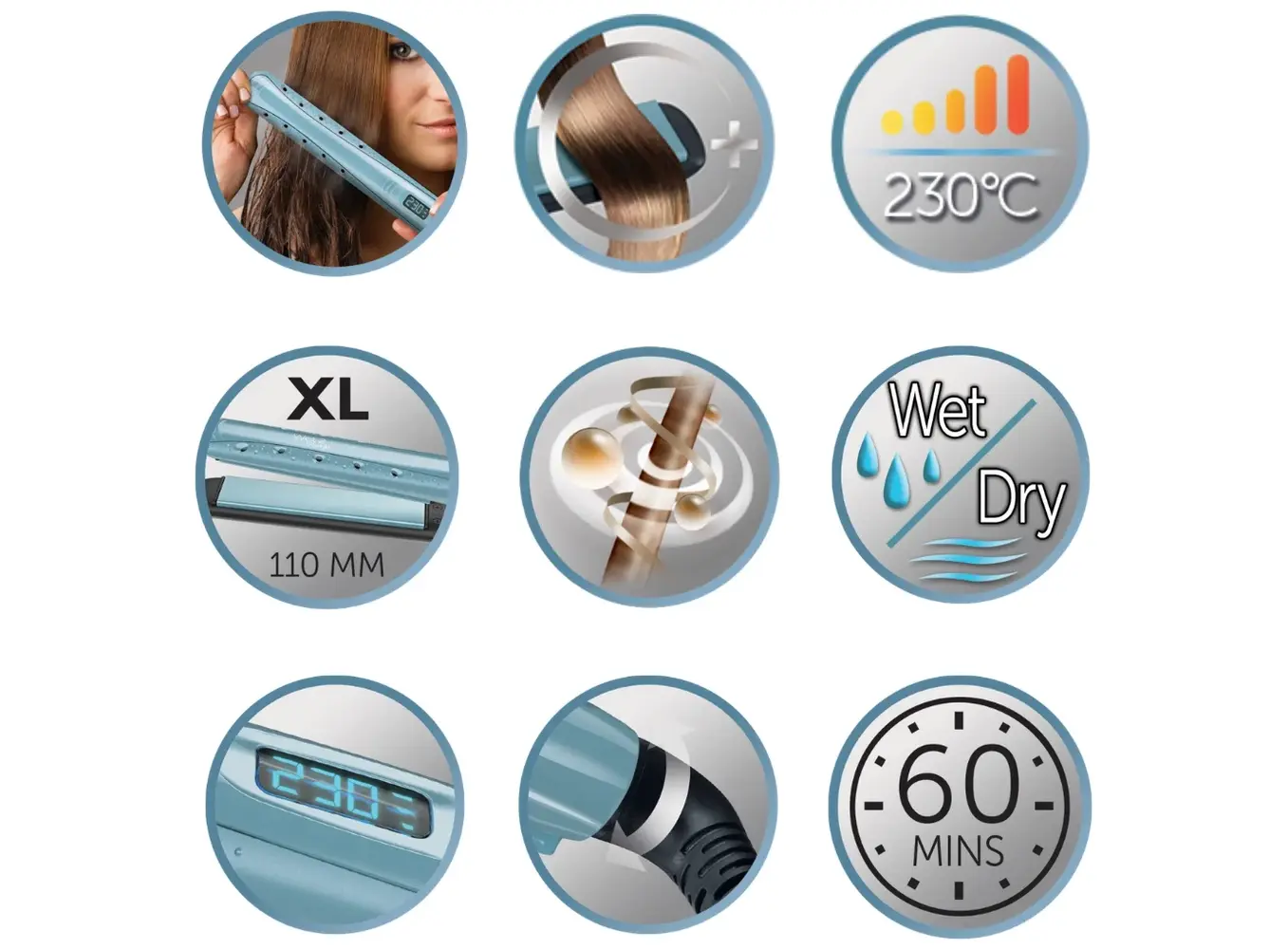 Remington S7300 E51 W2S თმის გასასწორებელი განკუთვნილია როგორც მშრალ, ისე სველ თმაზე გამოყენებისთვის. ინოვაციური Wet2Straight ტექნოლოგია დროულად აქრობს წყალს თმის ზედაპირიდან და ამცირებს ფენის საჭიროებას, რაც თმის ნაკლებ დაზიანებას უზრუნველყოფს. კერამიკული ფირფიტები ავსებულია თმის დაცვისთვის საჭირო მიკროვნით, რომლებიც ხელს უწყობს სიბზინვესა და გლუვობას. აღჭურვილია 10 ტემპერატურული რეჟიმით (140°C-დან 230°C-მდე) და 15 წამში მზად არის გამოსაყენებლად. ჩაშენებული ავტოგამორთვის ფუნქცია ზრდის უსაფრთხოებას. იდეალური არჩევანია მათთვის, ვისაც სურს სწრაფად, უსაფრთხოდ და ეფექტურად გაასწოროს თმა ყოველდღიურად.