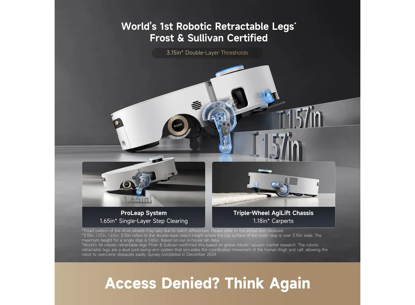 - ProLeap™ System: უნიკალური შასი, რომელსაც შეუძლია 8 სმ-მდე სიმაღლის ზღურბლებისა და დაბრკოლებების გადალახვა. რობოტი ფაქტობრივად "ახტება" დაბრკოლებებზე, რაც მას ყველაზე გამავალ რობოტად აქცევს ბაზარზე.
