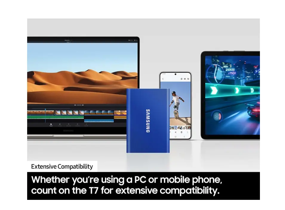 Samsung T7 Portable SSD არის სისწრაფისა და უსაფრთხოების იდეალური კომბინაცია კომპაქტურ კორპუსში. 2TB მოცულობის საცავი საშუალებას გაძლევთ თან ატაროთ უზარმაზარი ფაილები, 4K ვიდეოები და თამაშები. USB 3.2 Gen 2 ტექნოლოგიის წყალობით, მოწყობილობა აღწევს წაკითხვის 1,050 მბ/წმ-მდე და ჩაწერის 1,000 მბ/წმ-მდე სიჩქარეს, რაც თითქმის ორჯერ აღემატება წინა T5 მოდელს. მყარი, მონოლითური ალუმინის კორპუსი Gray (ნაცრისფერი) ფერში არა მხოლოდ დახვეწილად გამოიყურება, არამედ იცავს დისკს დაზიანებისგან 2 მეტრის სიმაღლიდან ვარდნის შემთხვევაშიც კი. მოწინავე თერმული კონტროლი იცავს მოწყობილობას გადახურებისგან მაღალი დატვირთვის დროს. Samsung T7 თავსებადია PC, Mac, Android მოწყობილობებთან და სათამაშო კონსოლებთან, რაც მას უნივერსალურ გადაწყვეტილებად აქცევს ნებისმიერი მომხმარებლისთვის.