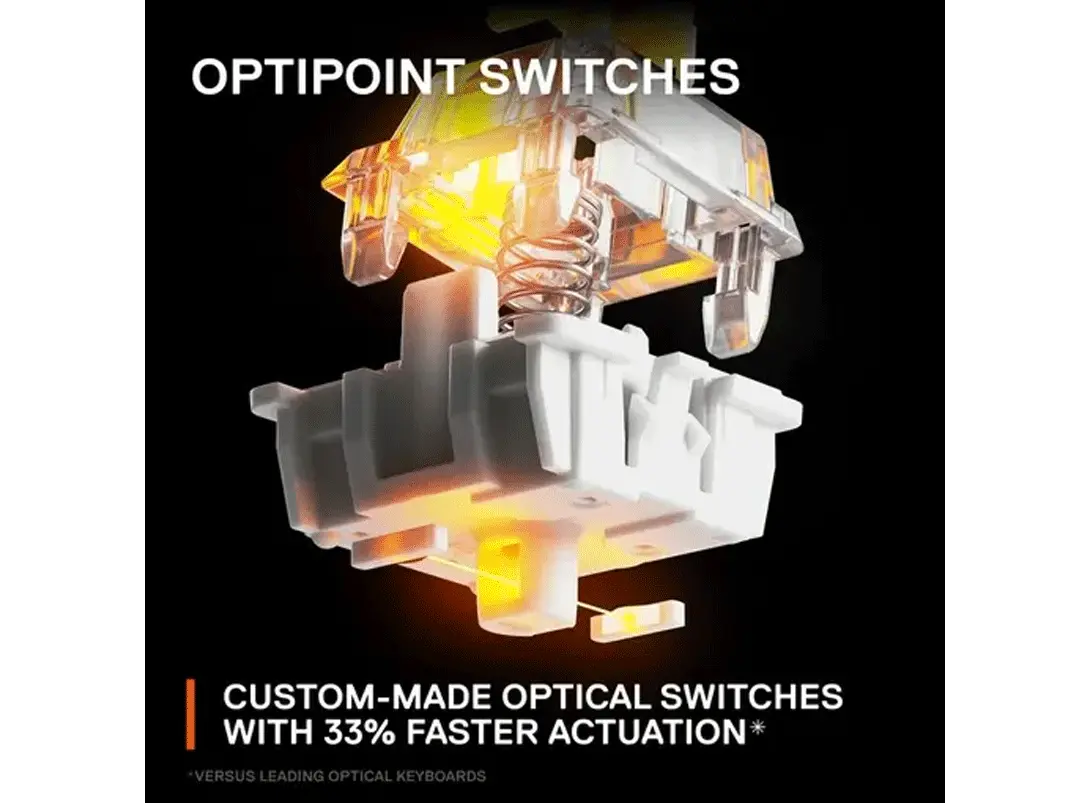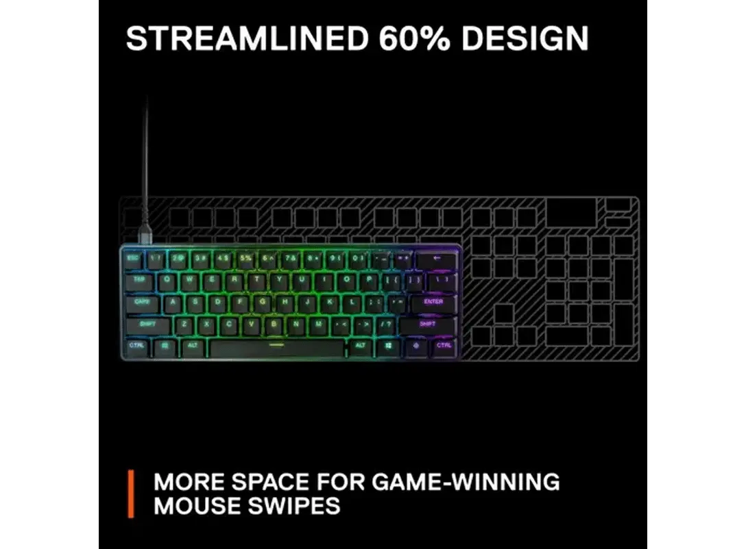 SteelSeries Apex 9 Mini მექანიკური კლავიატურა უზრუნველყოფს უახლეს ტექნოლოგიებს და მაქსიმალურ კომფორტს გეიმერებისთვის. 61 ღილაკიანი კომპაქტური ფორმფაქტორი TKL დიზაინის გარეშე ხდის მას იდეალურ არჩევანს იმ მოთამაშეებისთვის, ვისაც სჭირდება მეტი სივრცე მოძრაობისთვის. OptiPoint ოპტიკური სვიჩები უზრუნველყოფს წარმოუდგენლად სწრაფ რეაგირებას – 0.2 მმ-იანი ჩაწერის სიღრმით, რაც 33%-ით უფრო სწრაფია ტრადიციულ მექანიკურ კლავიატურებთან შედარებით.