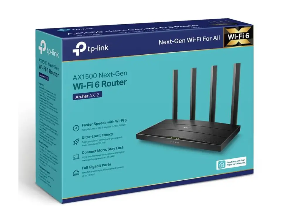 როუტერი TP-LINK Archer AX12/AX1500 Gigabit Wi-Fi 6 Router Dual-Band არის თანამედროვე ქსელური მოწყობილობა, შექმნილი სტაბილური, სწრაფი და საიმედო უსადენო ინტერნეტის მიწოდებისთვის სახლში ან მცირე ოფისში. უახლესი Wi-Fi 6 ტექნოლოგია უზრუნველყოფს ფართო ქსელის გაფართოებას და ძალიან მაღალ სიჩქარეს, რაც მნიშვნელოვანია ვიდეო ზარებისთვის, სტრიმინგისთვის, სათამაშოებისთვის და მრავალ მოწყობილობაზე ერთდროული ნავიგაციისთვის. Dual-Band მხარდაჭერა (2.4 GHz და 5 GHz) აფართოებს სიგნალის სიძლიერეს და იძლევა ინსტრუმენტებს ქსელის ოპტიმიზაციისთვის სხვადასხვა პირობებში. Gigabit პორტები უზრუნველყოფენ სწრაფ, მყარ კავშირს კაბელური მოწყობილობებისთვის. მარტივი კონფიგურაცია და ინტუიციური მართვის ინტერფეისი ამარტივებს სისტემის დაყენებას და ყოველდღიურ მართვას, ხოლო ძლიერი გამტარობა უზრუნველყოფს ქსელის სტაბილურ მუშაობას მრავალმხრივი საჭიროებებისთვის. TP-LINK Archer AX12 არის შესაფერისი არჩევანი მათთვის, ვისაც სურს თანამედროვე, ძლიერი და სწრაფი Wi-Fi ქსელი სახლის ან ოფისის სივრცეში.